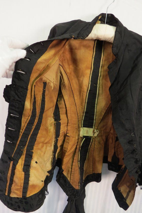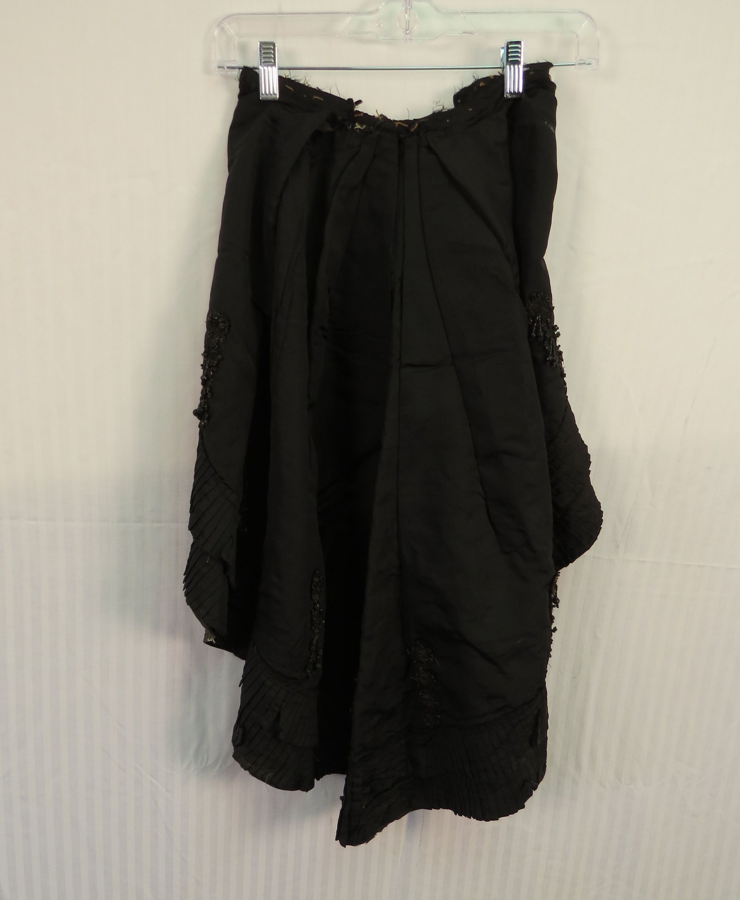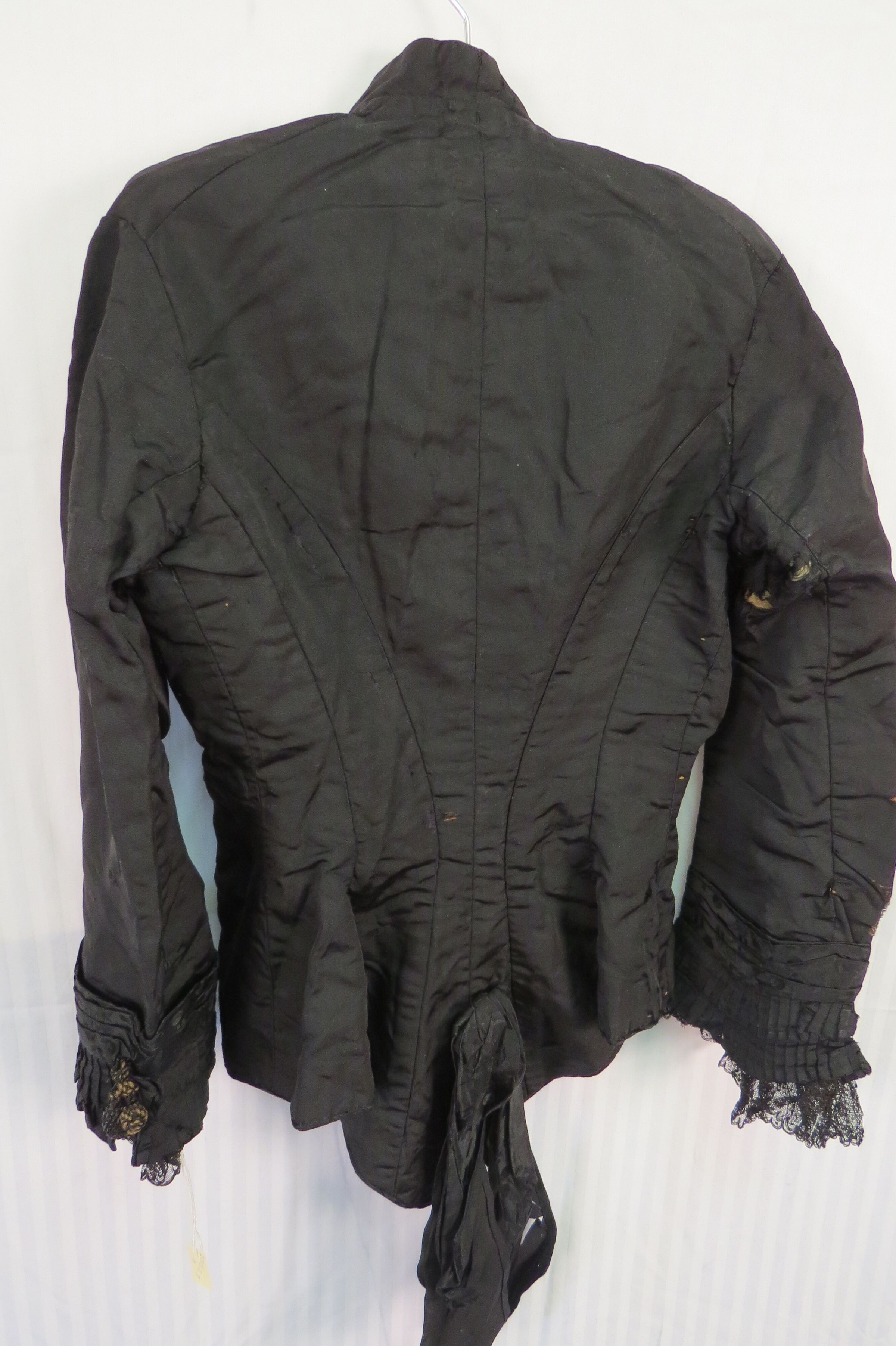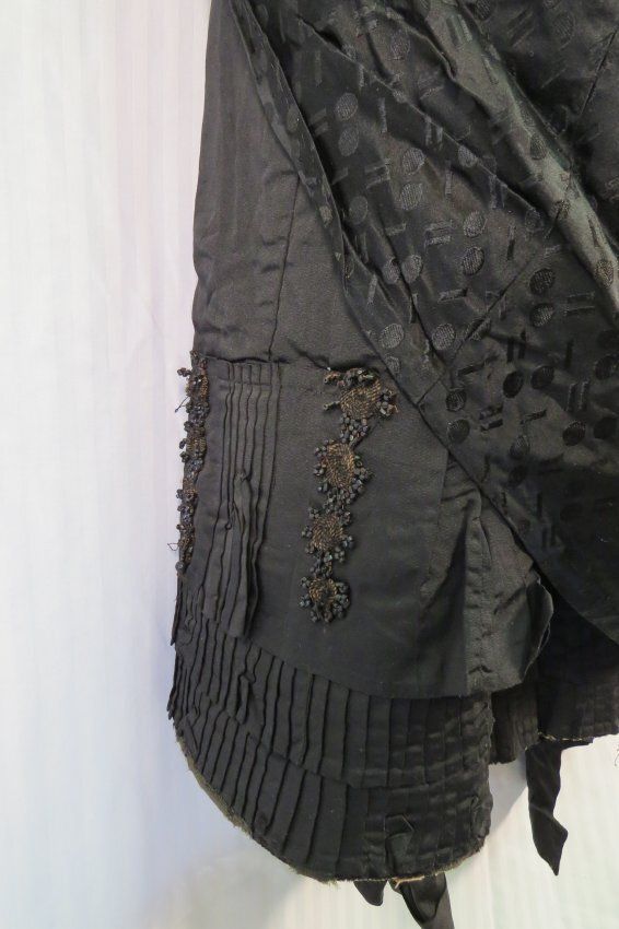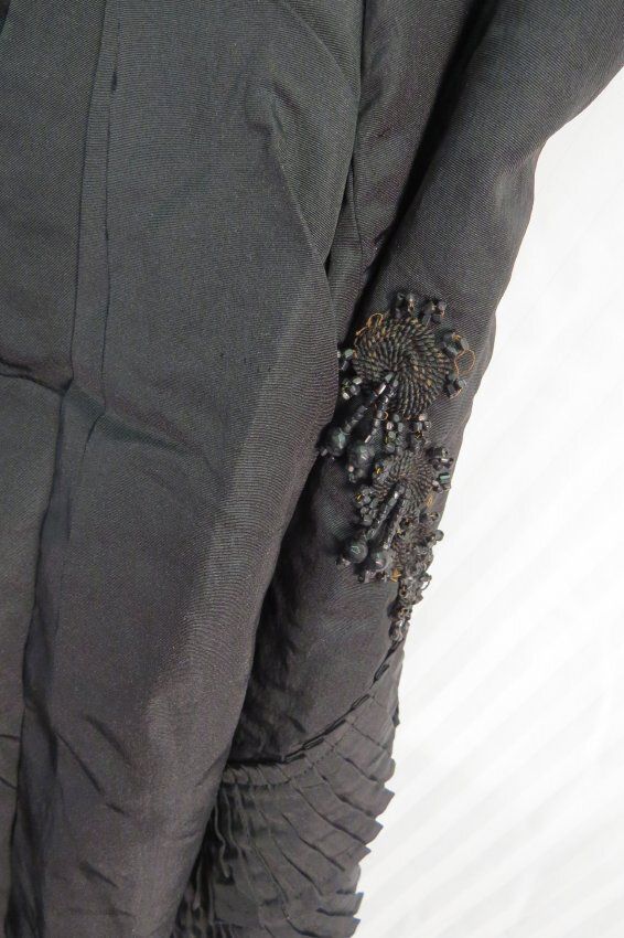 Three piece Black silk and Jet beaded wedding dress. The bodice (a) is fitted, long sleeved, and has a small stand-up collar. The sleeves have lace, pleated self-fabric, and jet beading details with beaded wooden ball at elbow. The garment is flat lined with a cotton materials often known as cambric. Bodice opens down front with hand sewn buttonholes and intricate little oval buttons. In back is a (now smashed down) large silk bow at the center back bottom. There is room for a small bustle.
