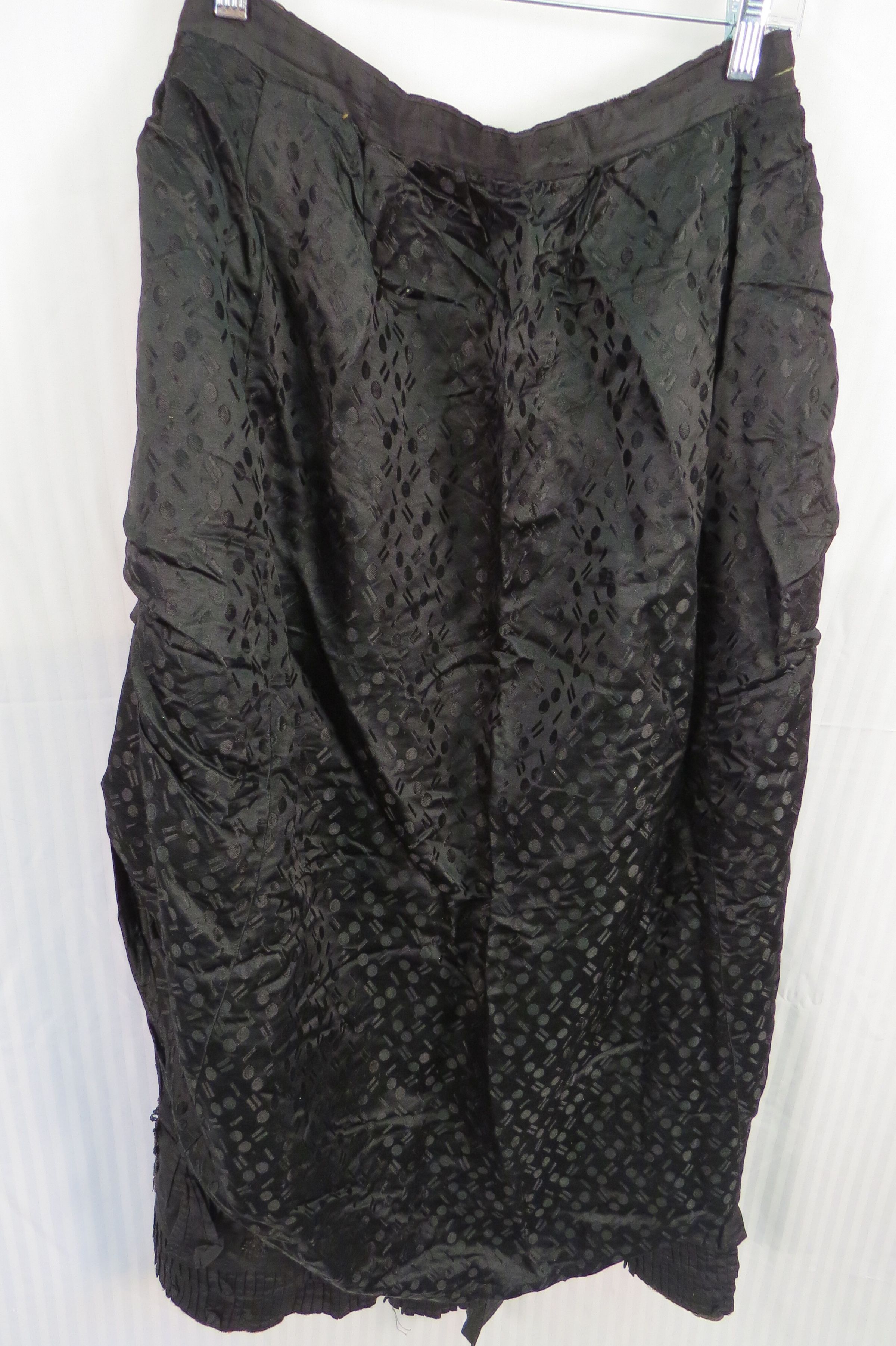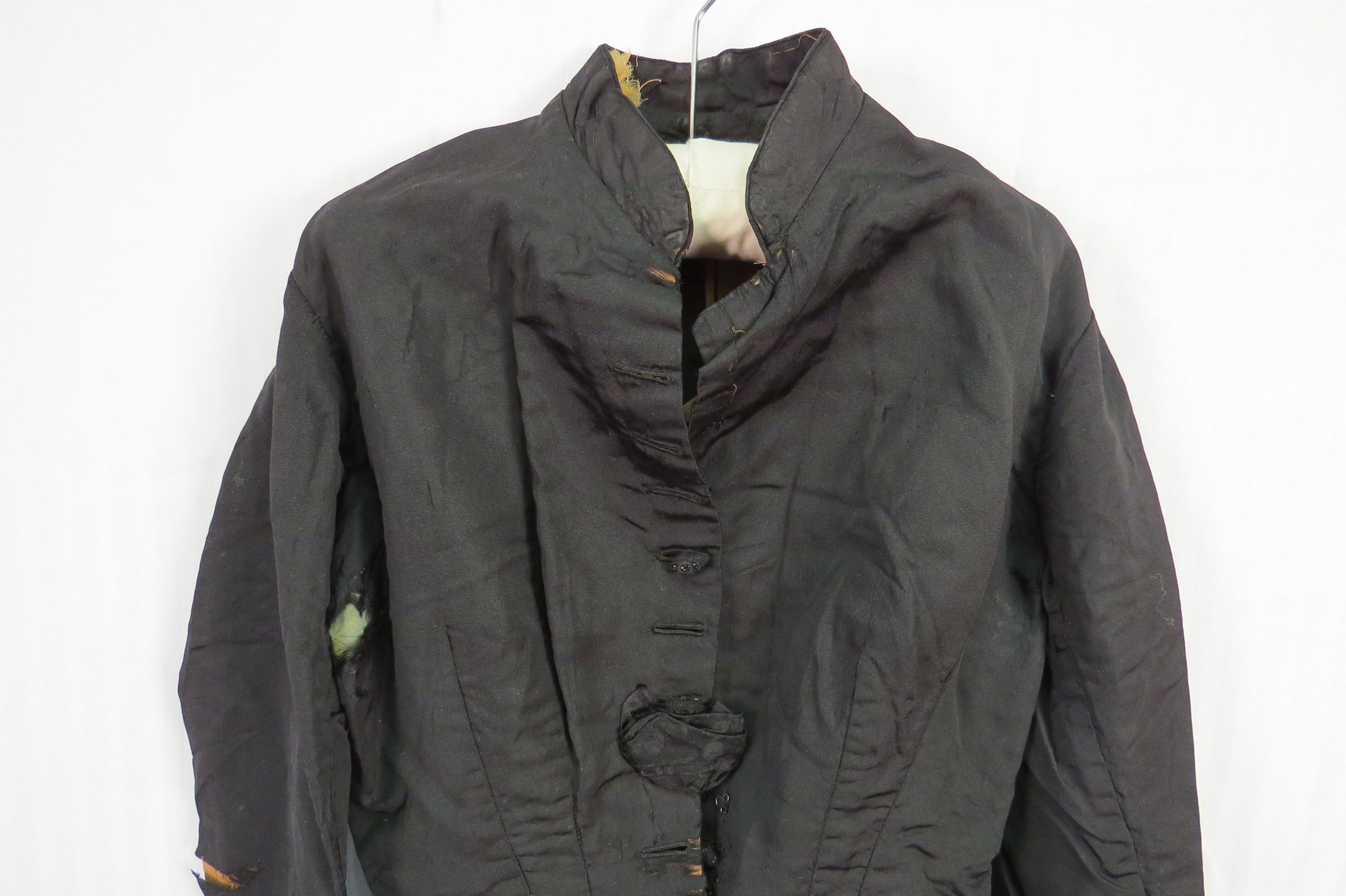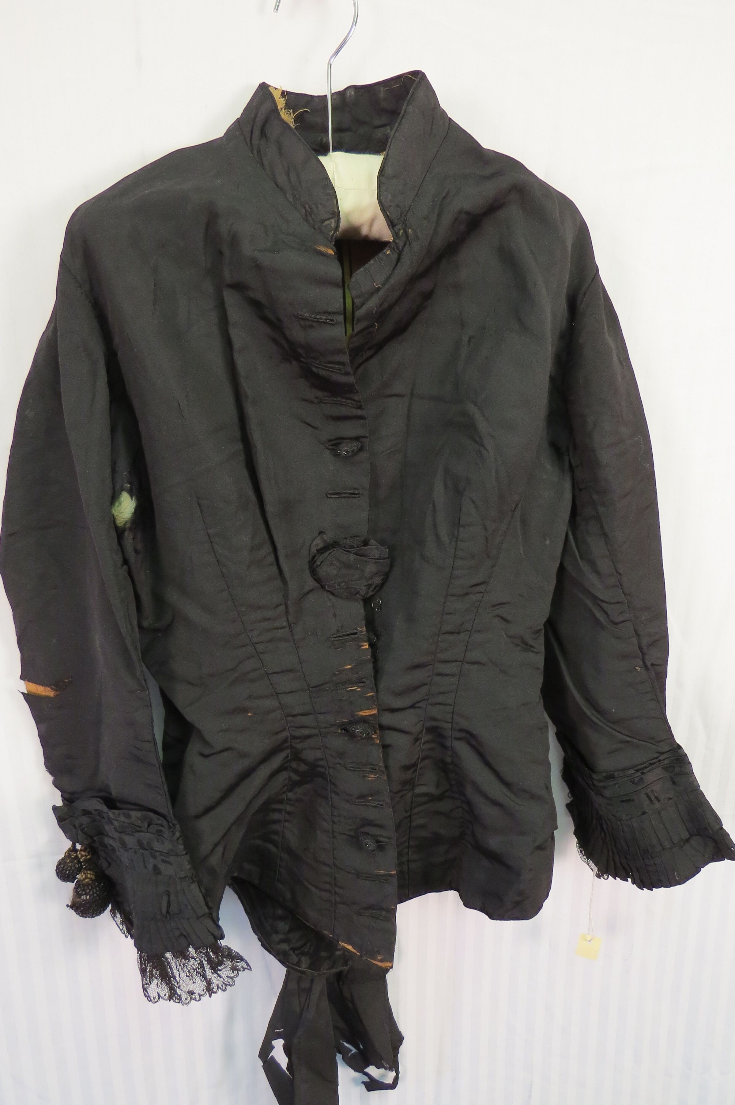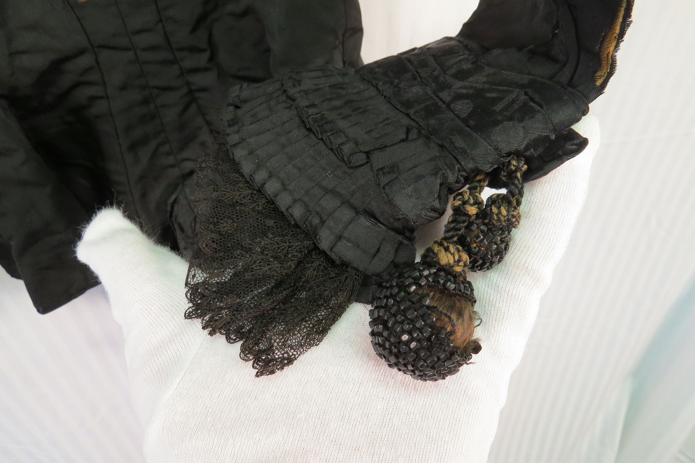 Three piece Black silk and Jet beaded wedding dress. The bodice (a) is fitted, long sleeved, and has a small stand-up collar. The sleeves have lace, pleated self-fabric, and jet beading details with beaded wooden ball at elbow. The garment is flat lined with a cotton materials often known as cambric. Bodice opens down front with hand sewn buttonholes and intricate little oval buttons. In back is a (now smashed down) large silk bow at the center back bottom. There is room for a small bustle.