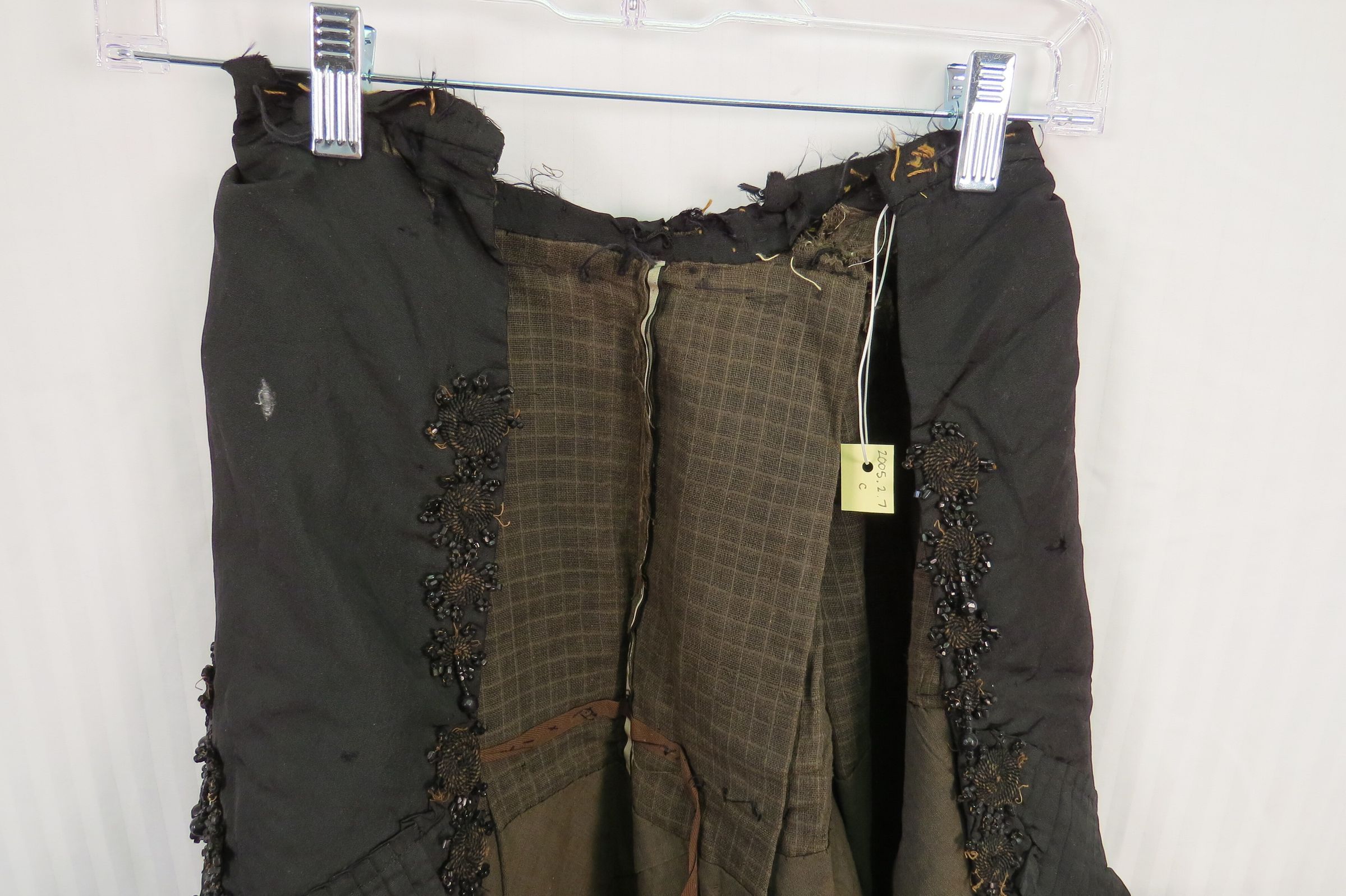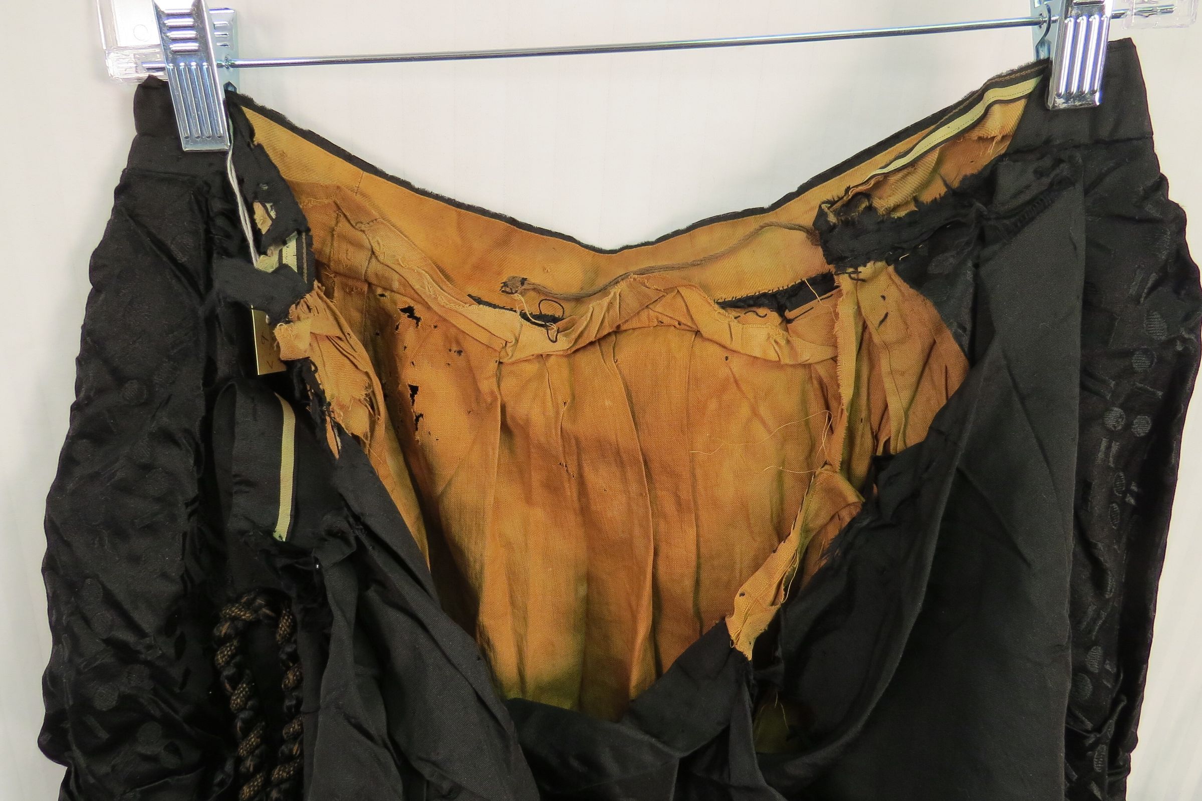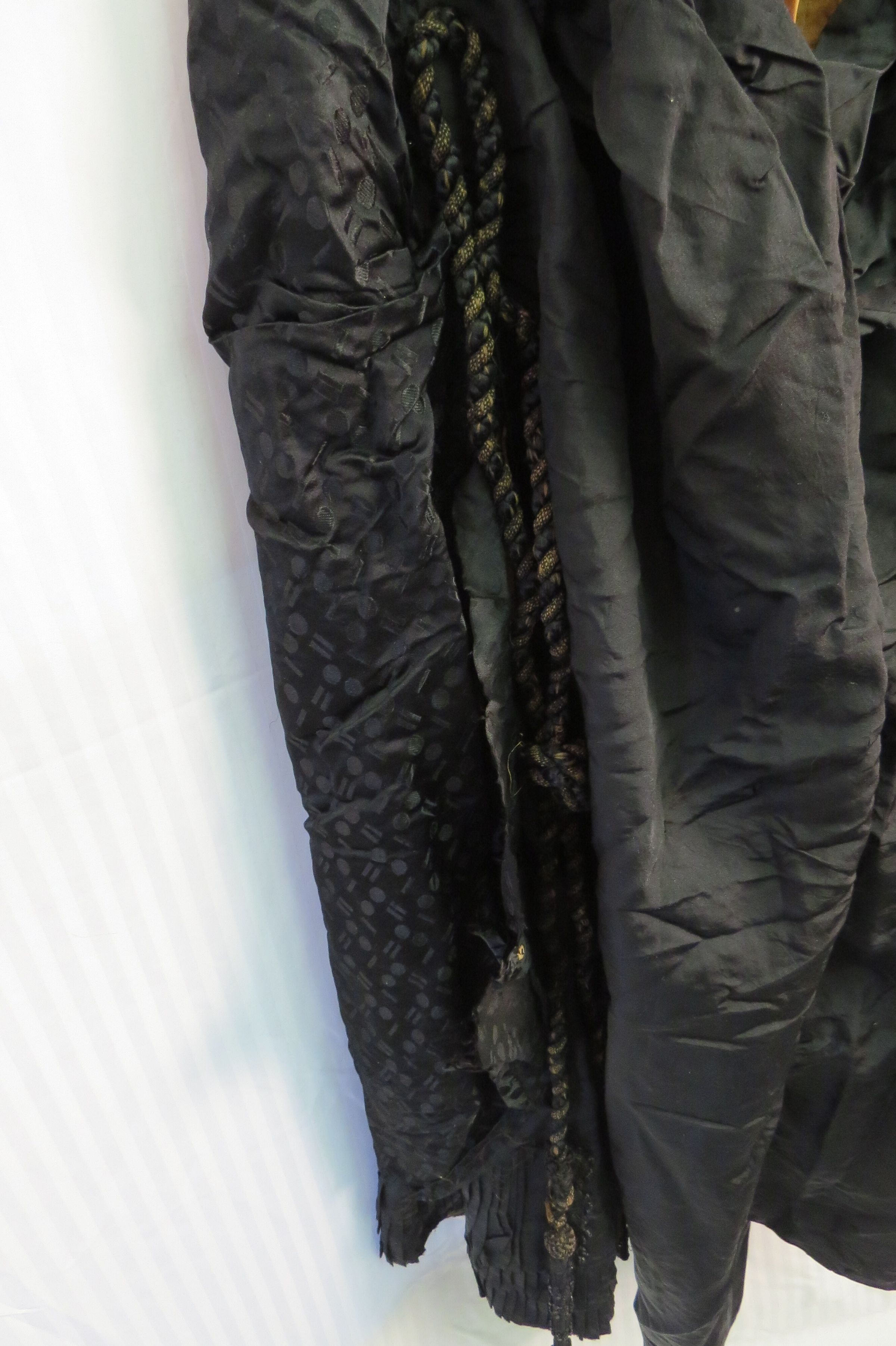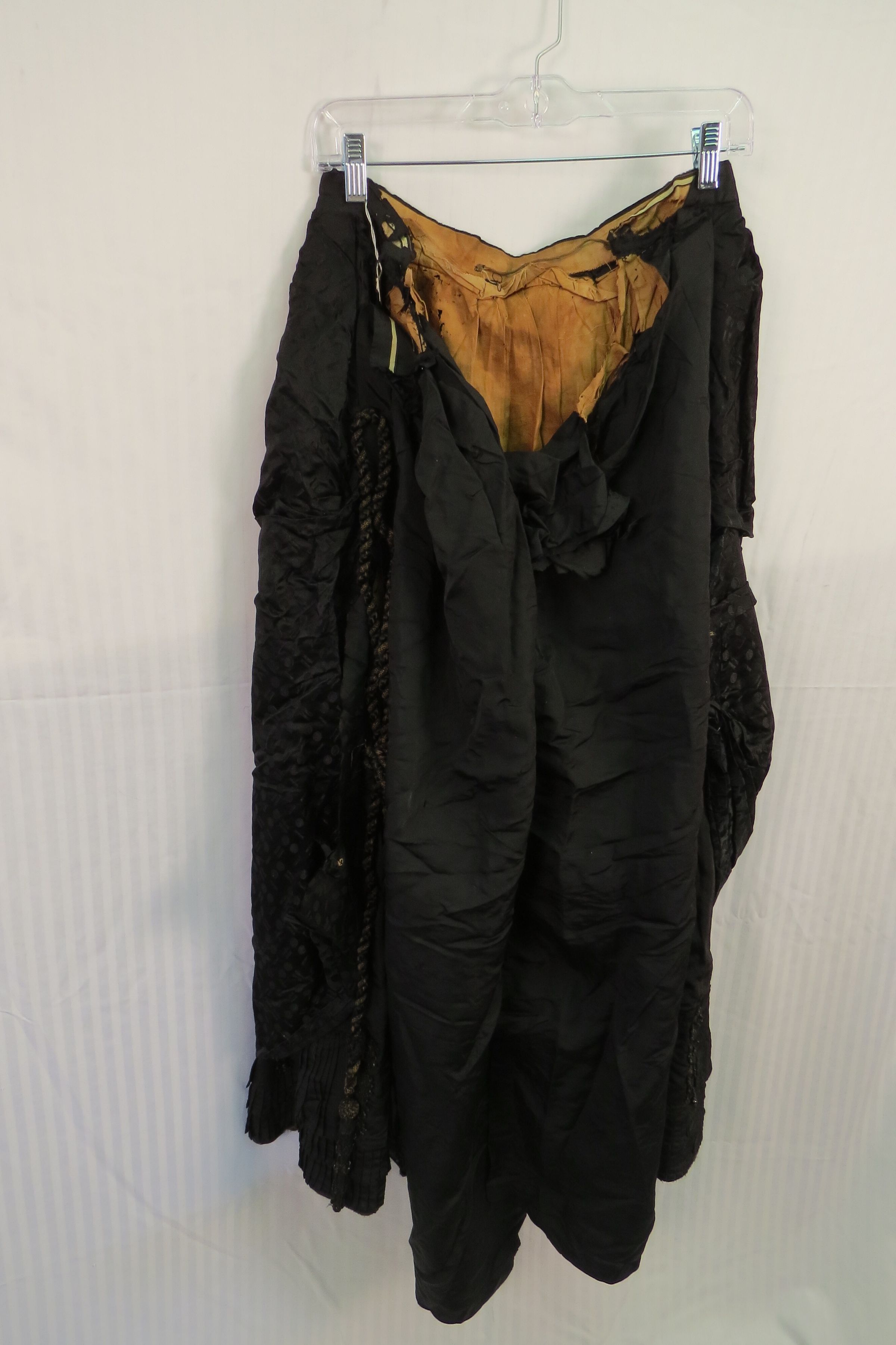 The skirt (b) has a jacquard material over skirt with the same silk as bodice underneath. Pleats, beading and large black cords adorn the skirt, mostly at the bottom and sides.