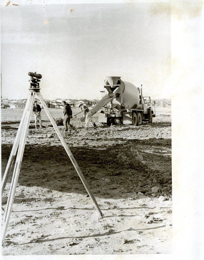 newspaper cutline "Work Resumes" , aggregate / concrete / cement truck and three men working on groundbreaking of new building in Broomfield, possibly Highlander Apartment Buildings, looks like the area North of 9th Ave and SheridanCollection
