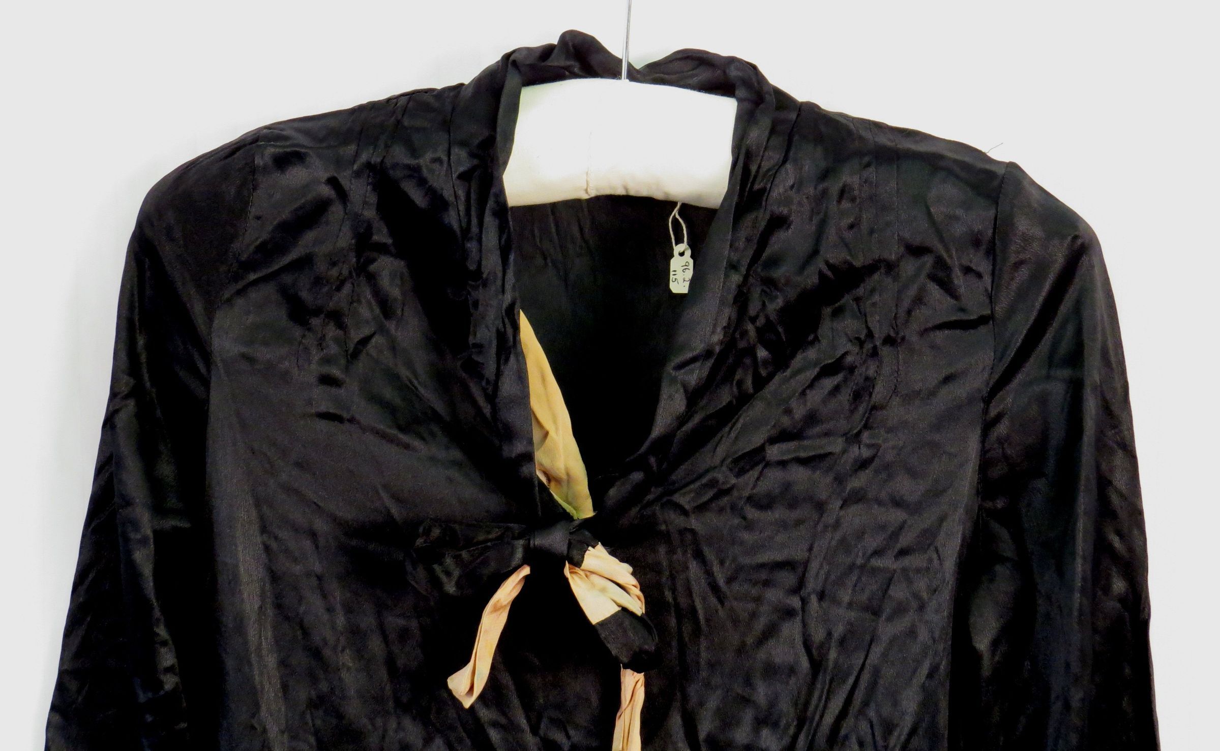 Black silk dropwaisted dress. Large tied bow drapes from neckline. Long sleeves with light tan cuff. Fairly straight shift style dress through bodice, belt is attached low for the dropwaisted effect. Partly covers smocking. Intricate embroidery around the hem. The dress measures 21" (w) x 31.5" (l).Collection