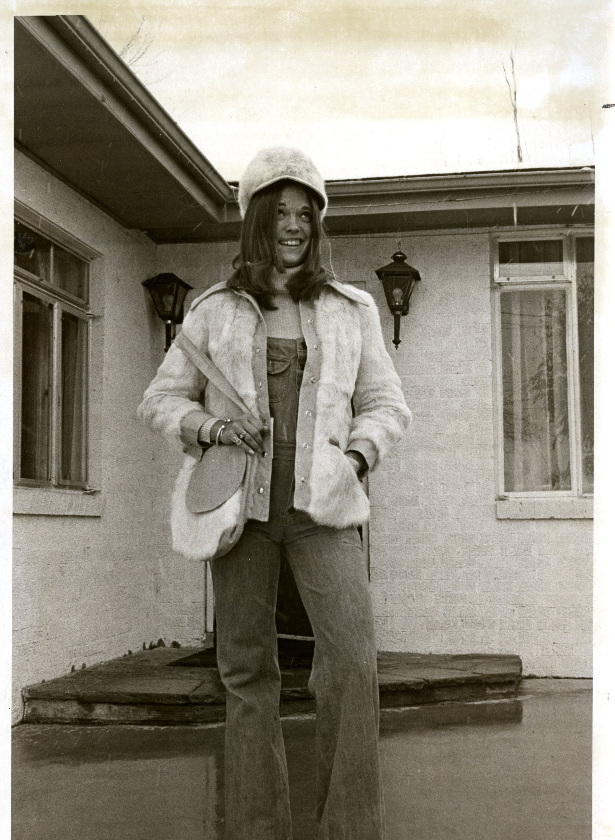 Young woman (Maja Runstrom Kaiser) showing off her outfit for a fashion show, newspaper cutline "On The Sporty Side", fashion for 1970's