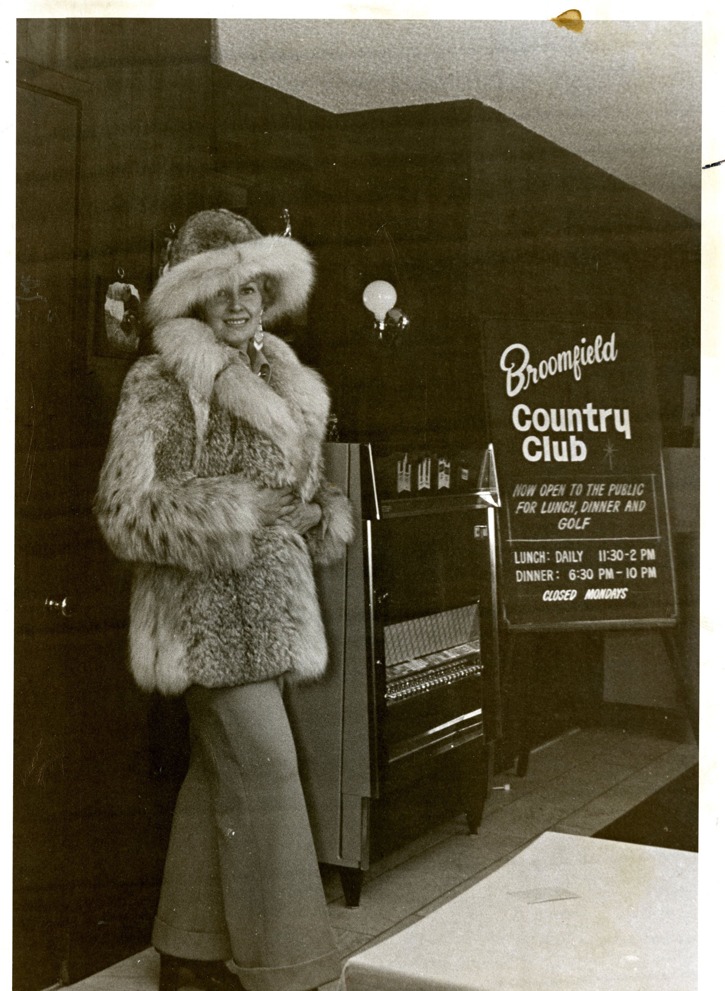 Woman (Barbara Spader) at the Broomfield Country Club wearing a fur coat and hat, "A Striking Natural." Cigarette vending machine visible in background.