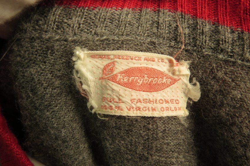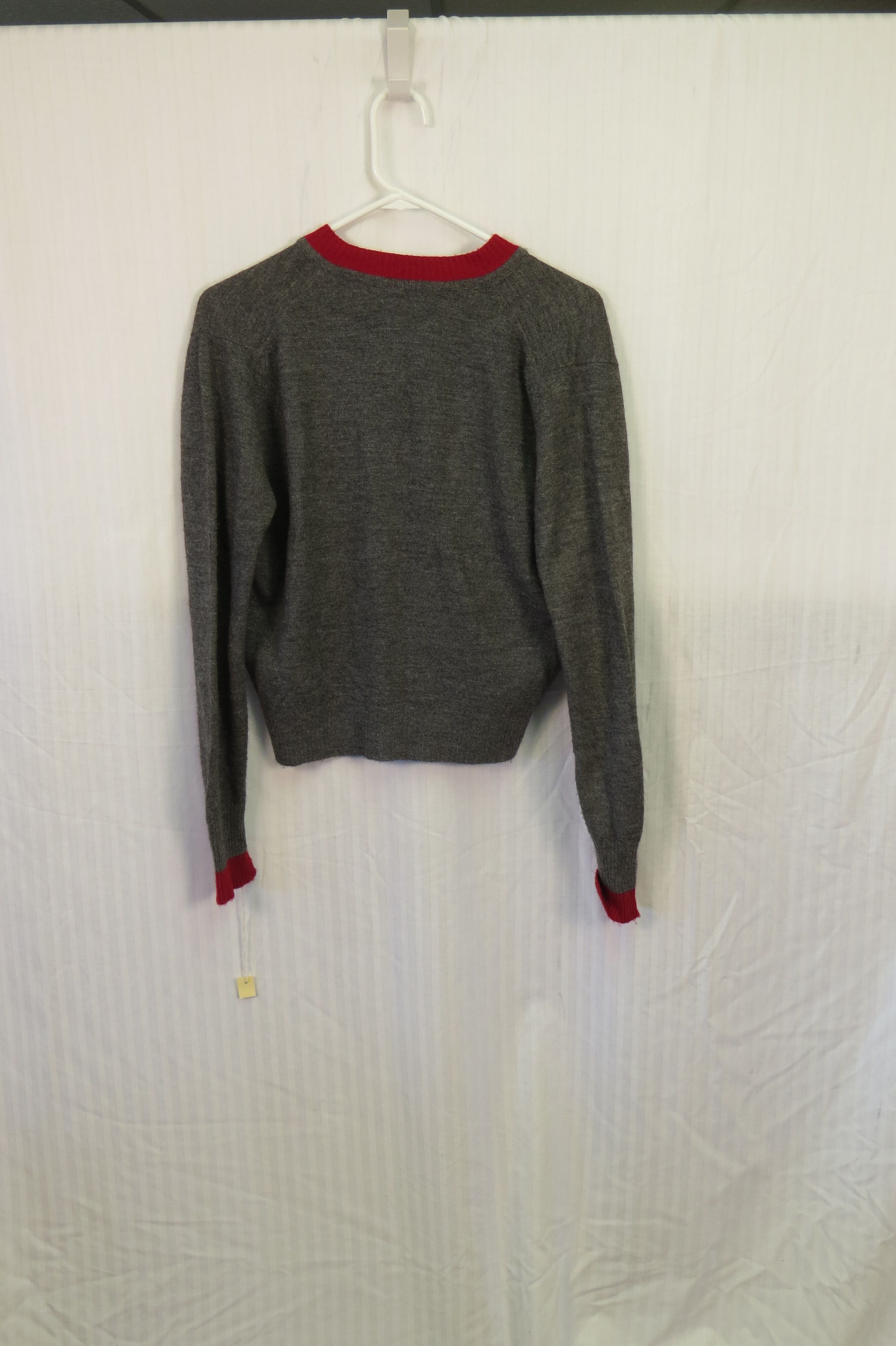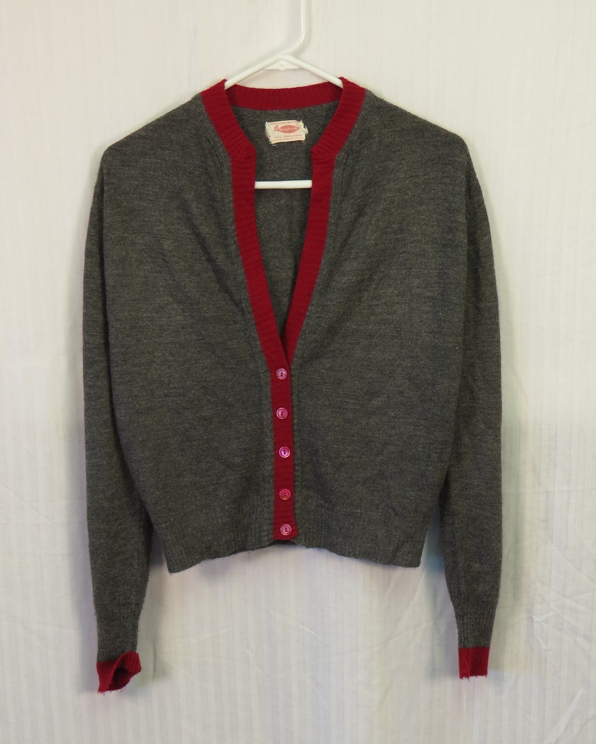 Grey 100% Virgin Orlon (acrylic) cardigan with red accents. The red trim surrounds the circular neckline and down front button opening, also at sleeve cuff. Five red buttons close up the front. Cardigan measures 16" (w) x 48" (l).Collection
