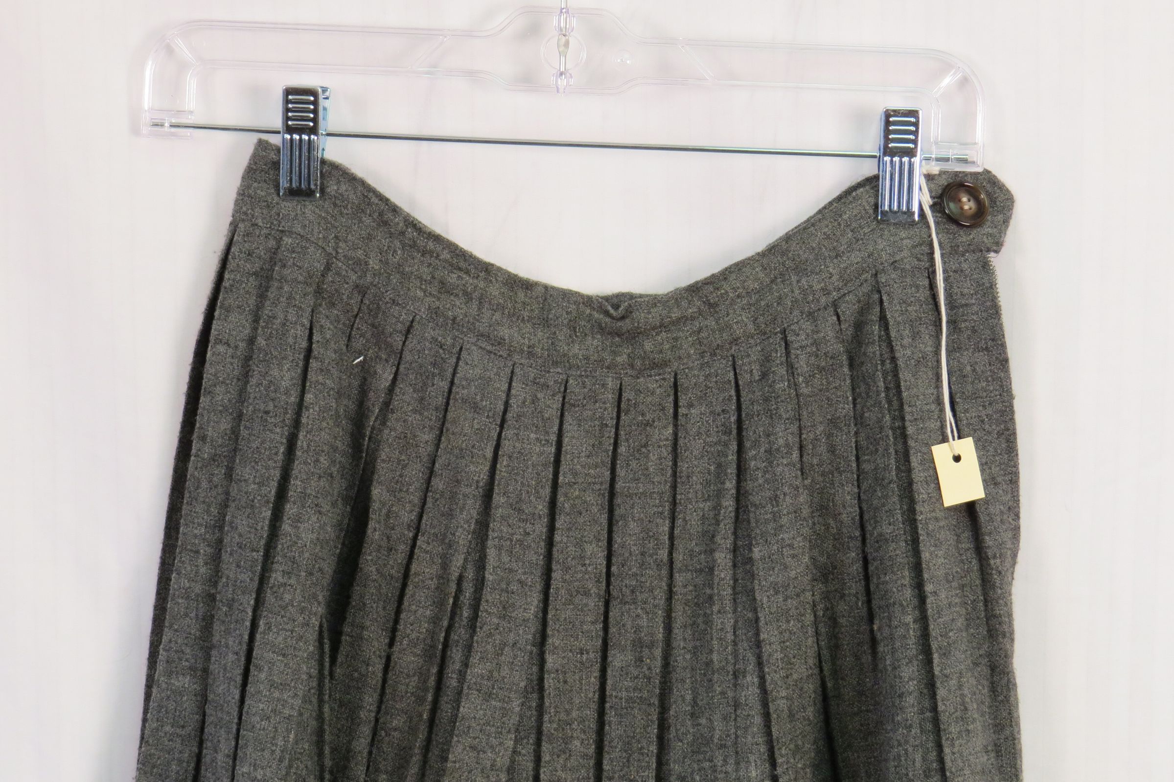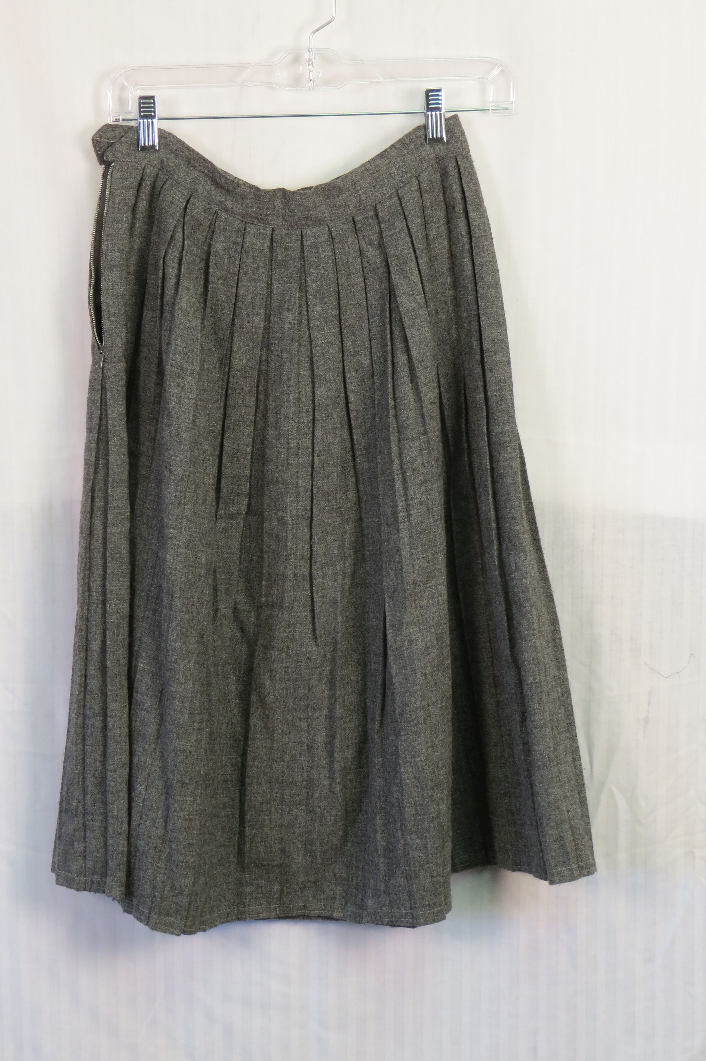 Gray pleated acrylic skirt. Waistband with side button and zipper. Slightly lower than knee length. Skirt measures 33" (l).Collection