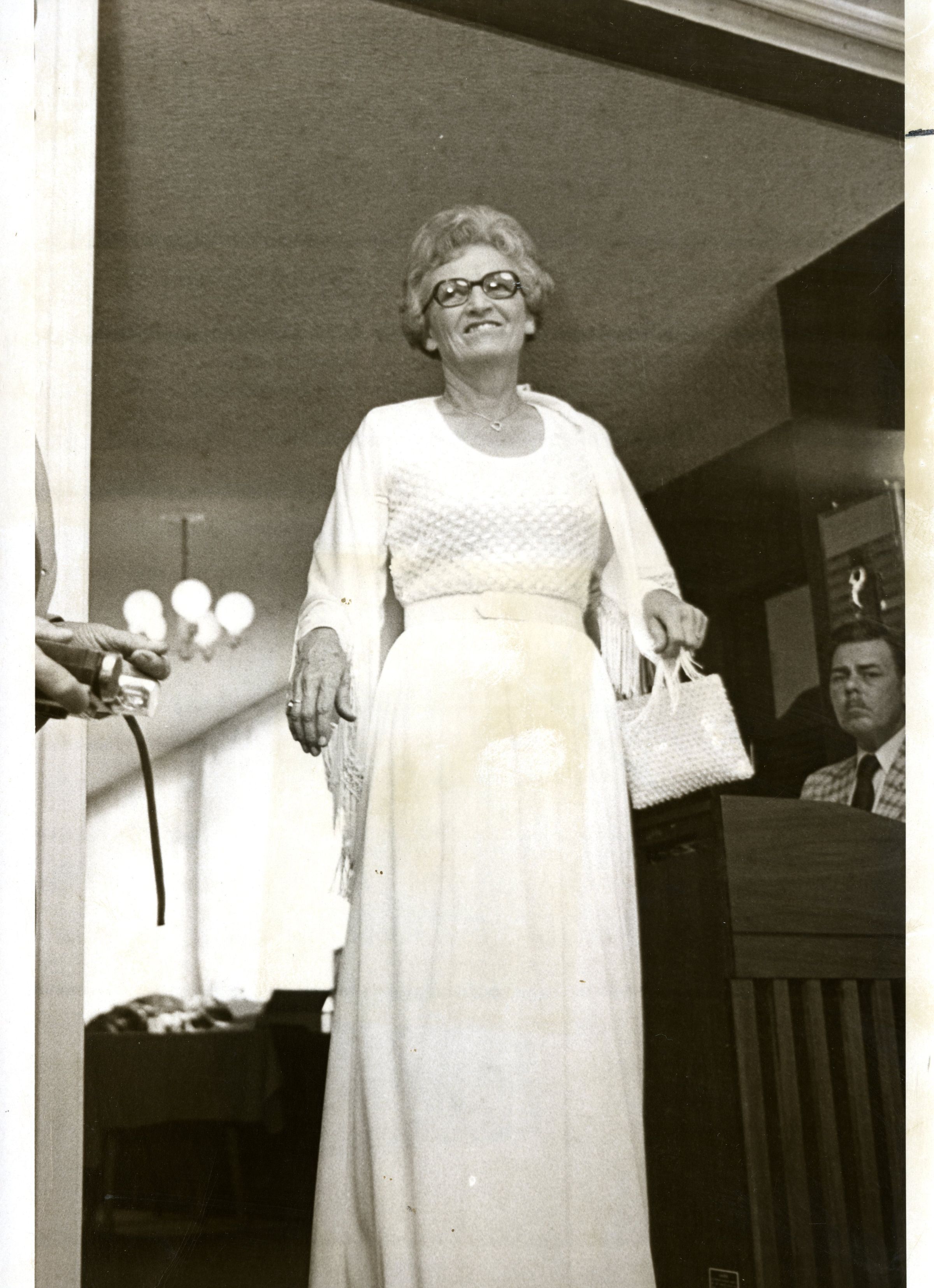 woman (Doris Boland) modeling a dress with shawl and purse, possible fashion show at the Broomfield Country Club 1974