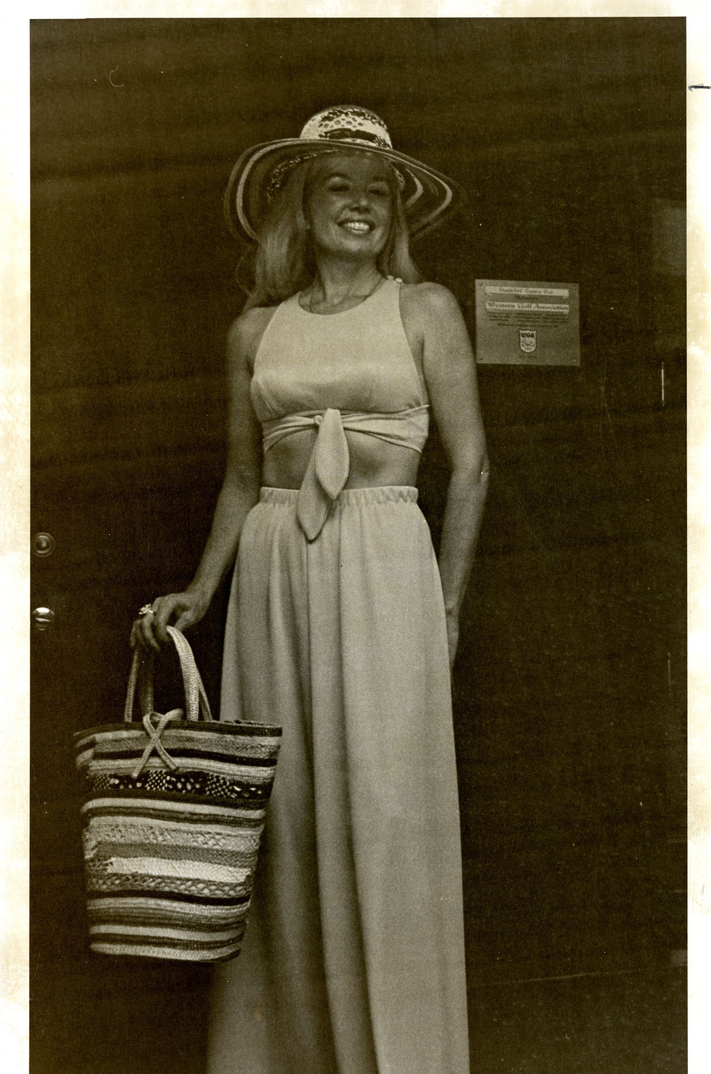 woman modeling a two piece sun outfit, with beach / sun hat and large tote bag or purse, at the Broomfield Country Club, possible fashion show, newspaper cutline "Doris Boland Anticipates"