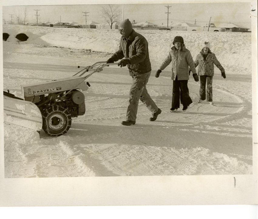 Man snow blowing an area, possible south side of Midway Blvd west of the Catholic Church, newspaper cutline "Can't Wait", with two girls wearing iceskates that can't wait to get skating the area