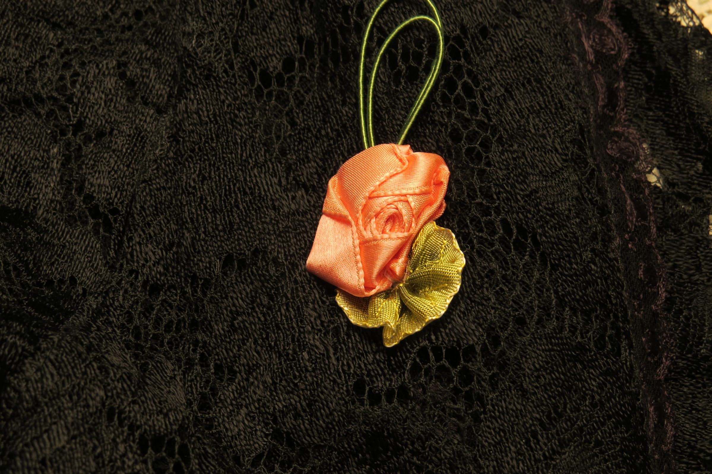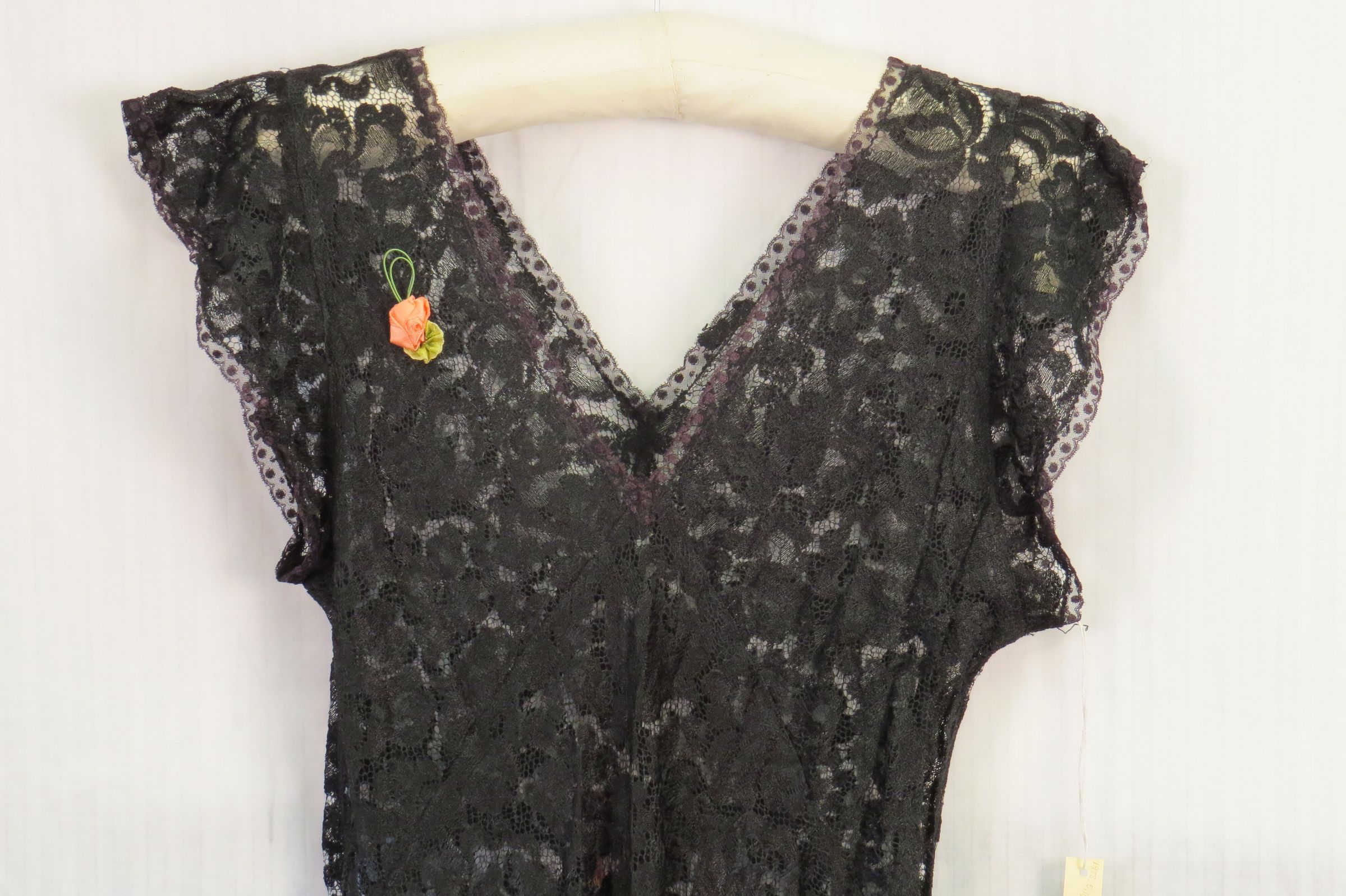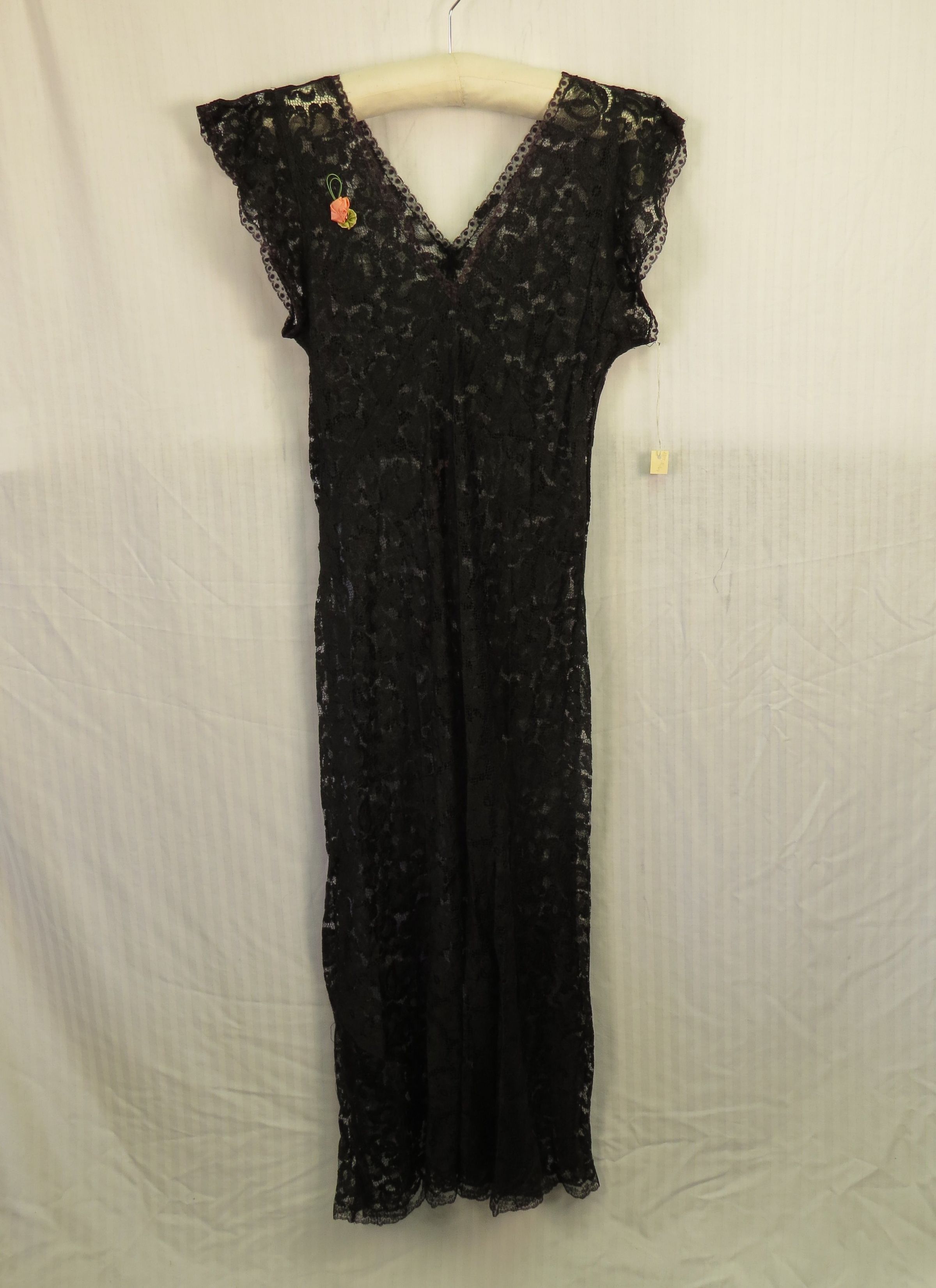 This is a black lace full-length dress with a deep V neck in both the front and the back. There is a small pink rosette on the upper right chest area of dress. A pink belt attached at the back. The dress measures 60" (l).Collection