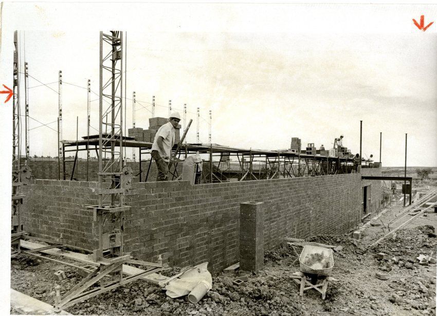 Masonary man at a new construction site, Broomfield, three more workers (men) in background