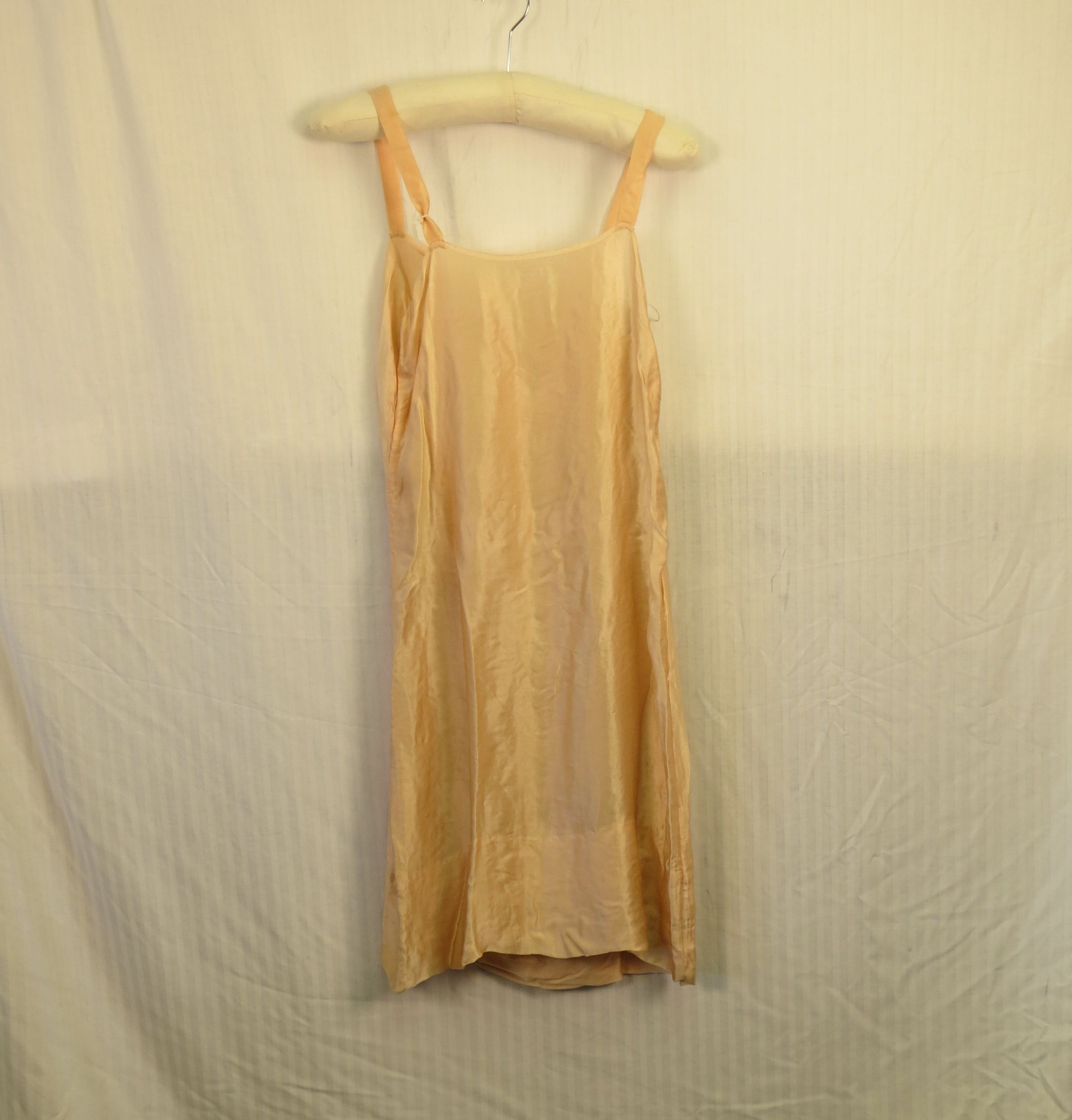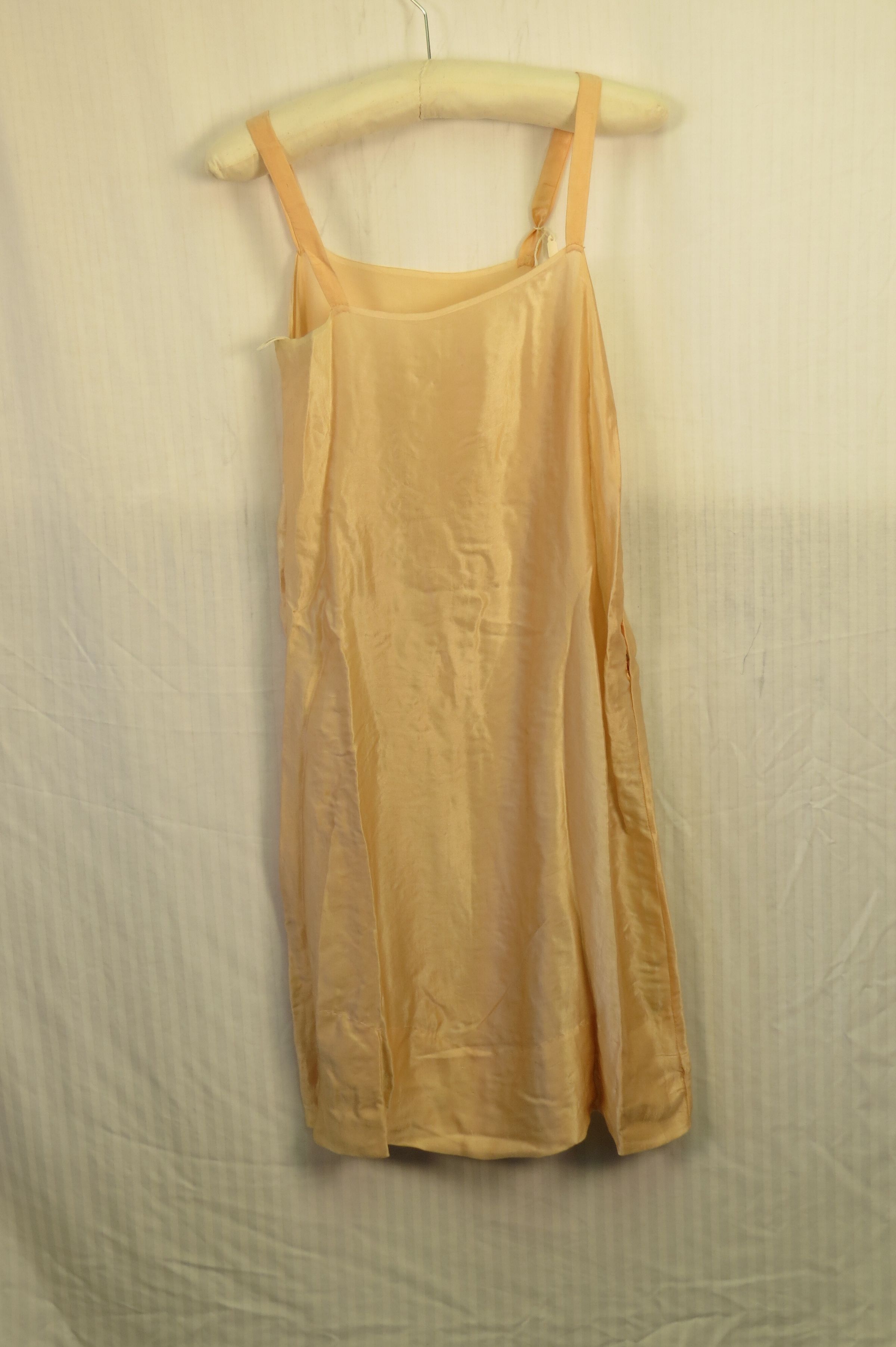 This slip goes with dress 2018.30.7. Simple A-line cut with two one inch wide spaghetti straps. It is a baby pink color. Very simple and basic design and construction. The slip measures 18" (w) x 42" (l).