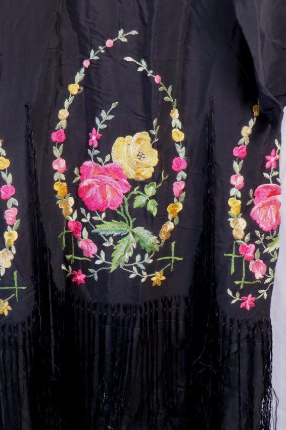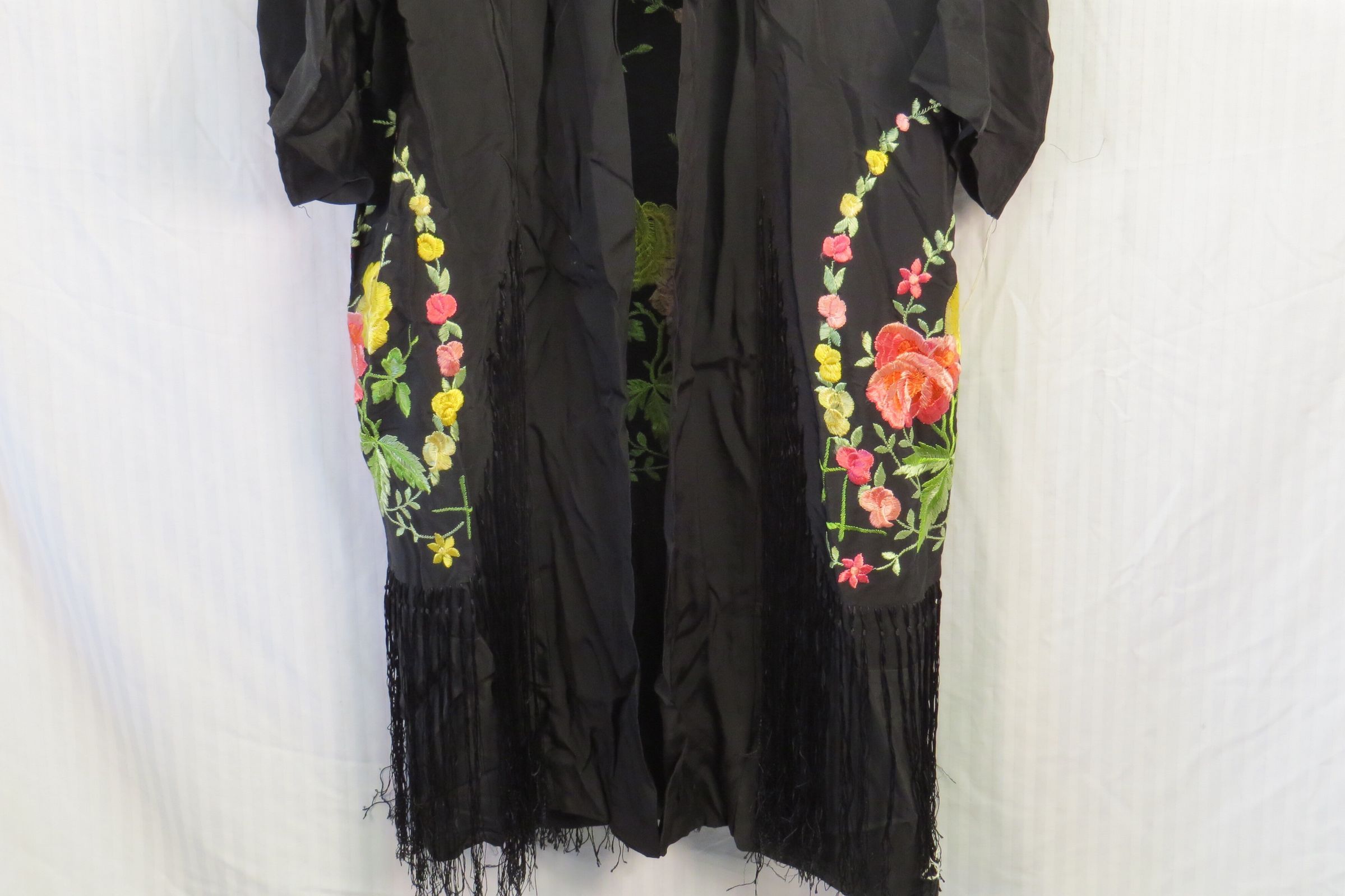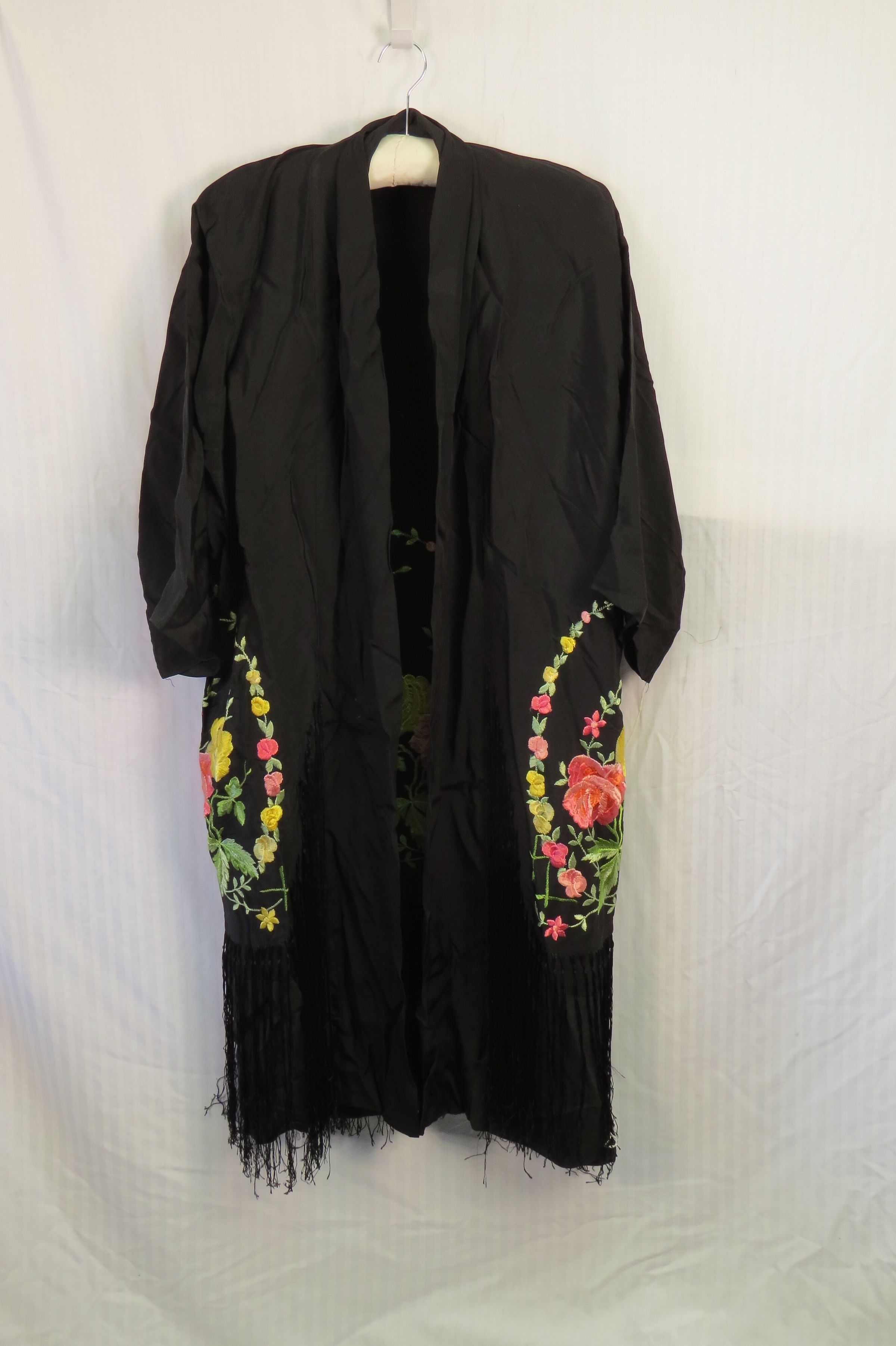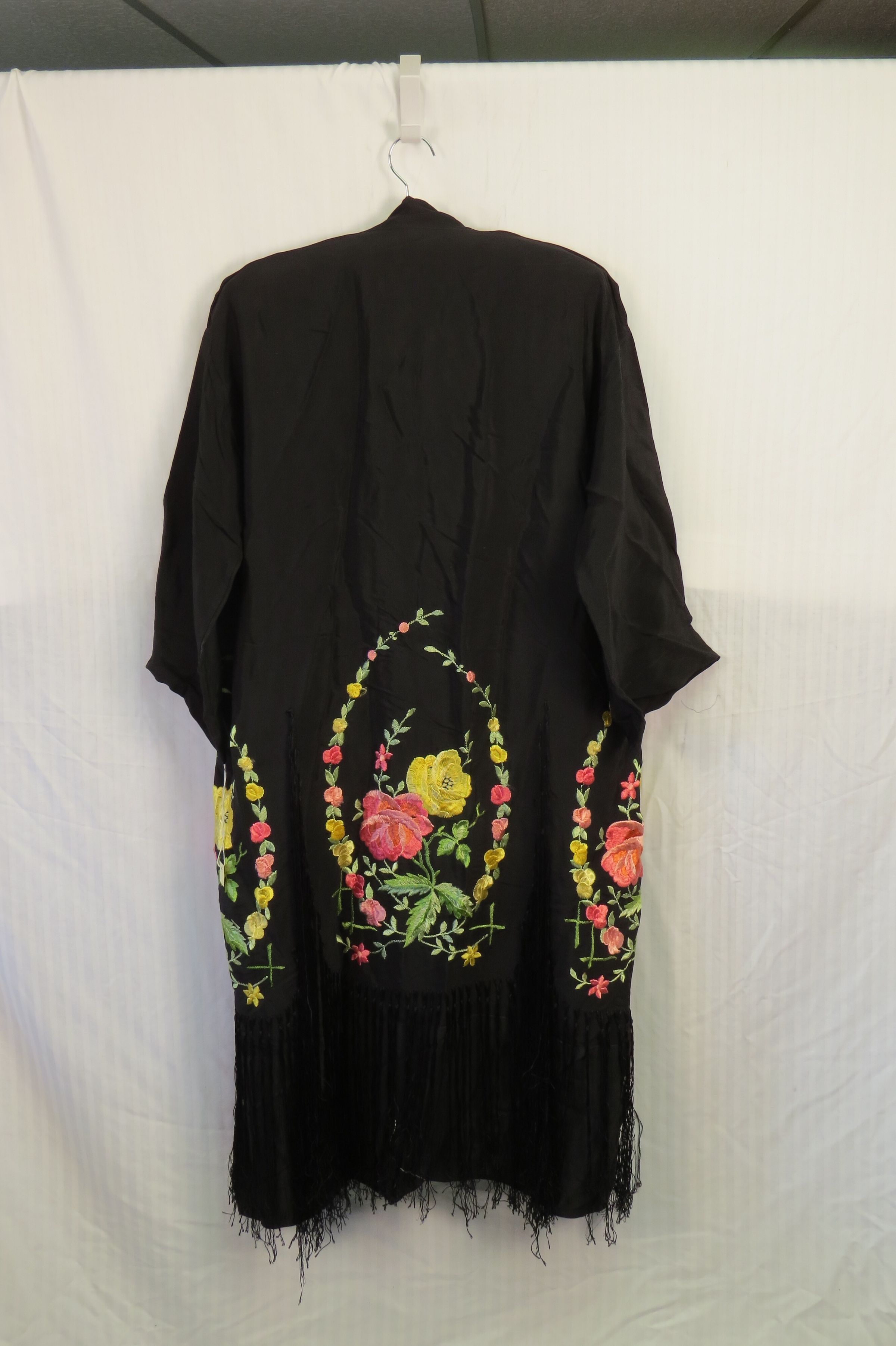 This is a black dressing jacket with large shawl collar and 3/4 length slightly baggy sleeves. There is long black fringe on the sleeves. Brightly colored embroidery decoration is present on the lower half of the garment. The dressing jacket measures 21" (w) x 46" (l).Collection