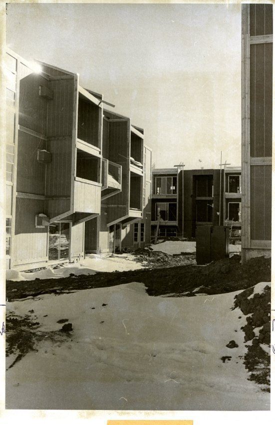 New Apartments partially constructed, Partridge Court Apartments in March 1974, newspaper cutline "Broomfield Looks" "Ready in March"