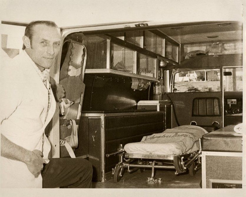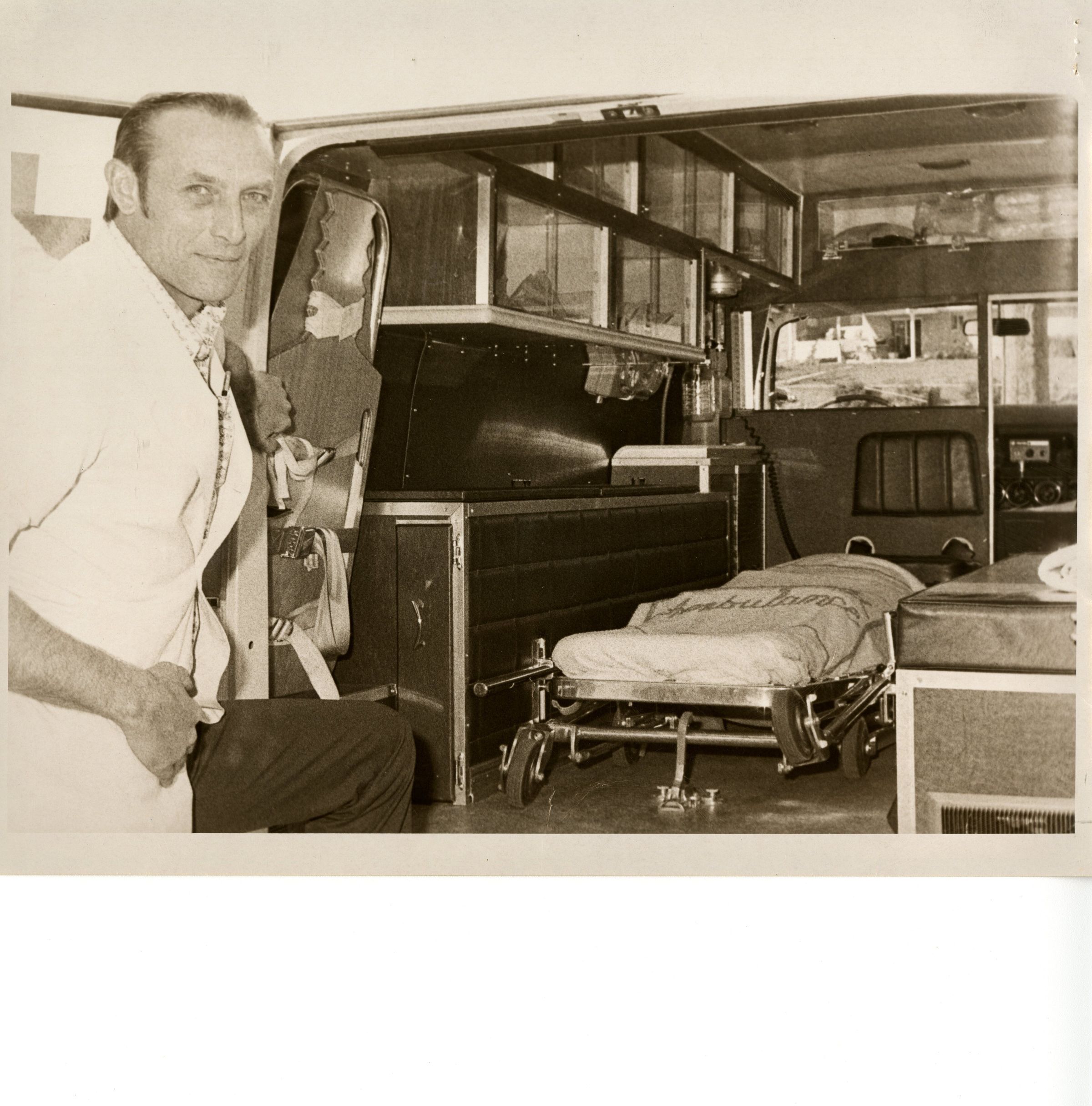 Ambulance employee showing the inside of an ambulance in 1974