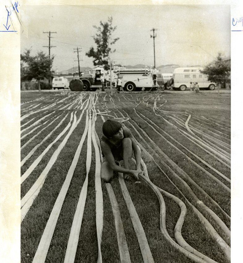 Randy Chestnut helping with the hoses from the fire fighting engine / truck on the south side of Midway Park south of the Fire Station.