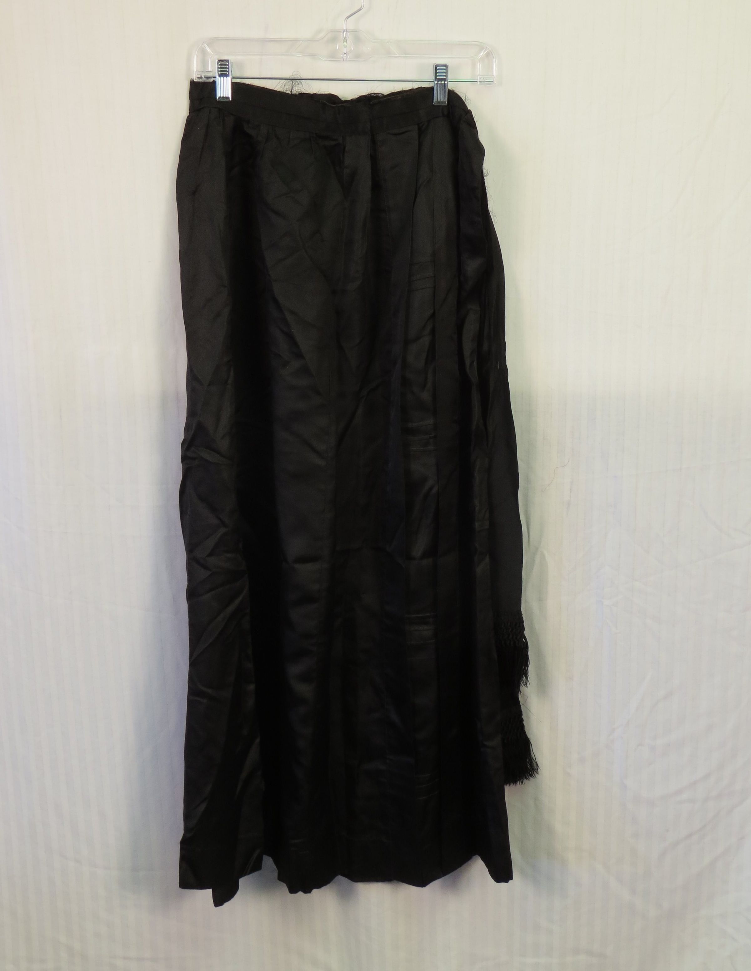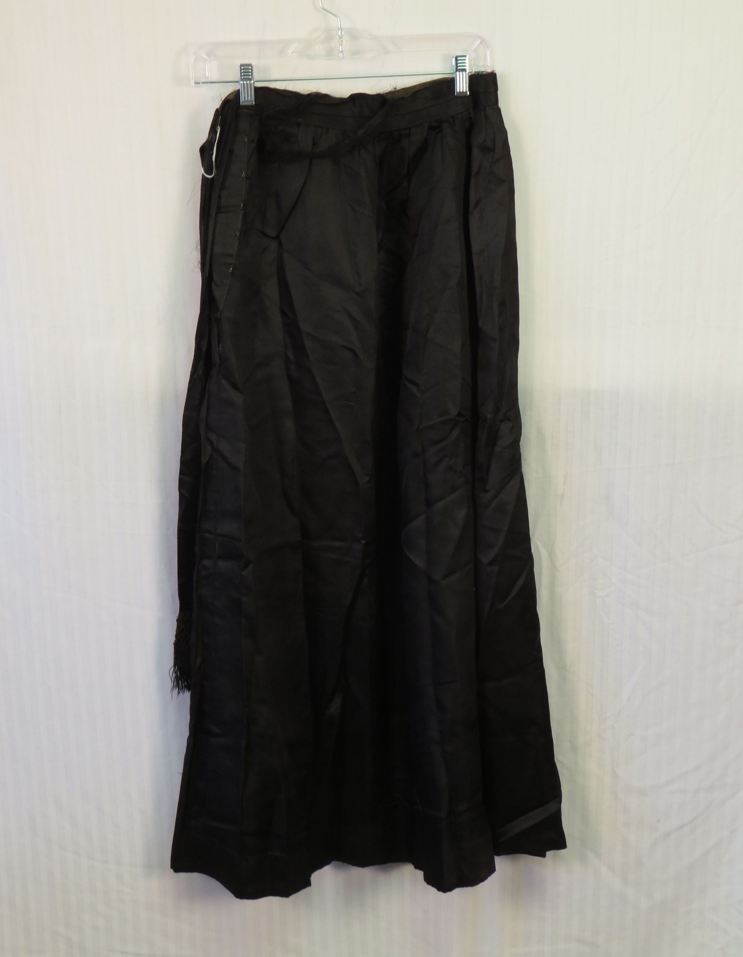 This is a black silk or satin skirt with a stiffened waistband and a large decorative sash that ends with long tails at one side. At the ends of the sash are fringe details. There is a hook and eye closure on the side. The skirt measures 17" (w) x 39" (l).