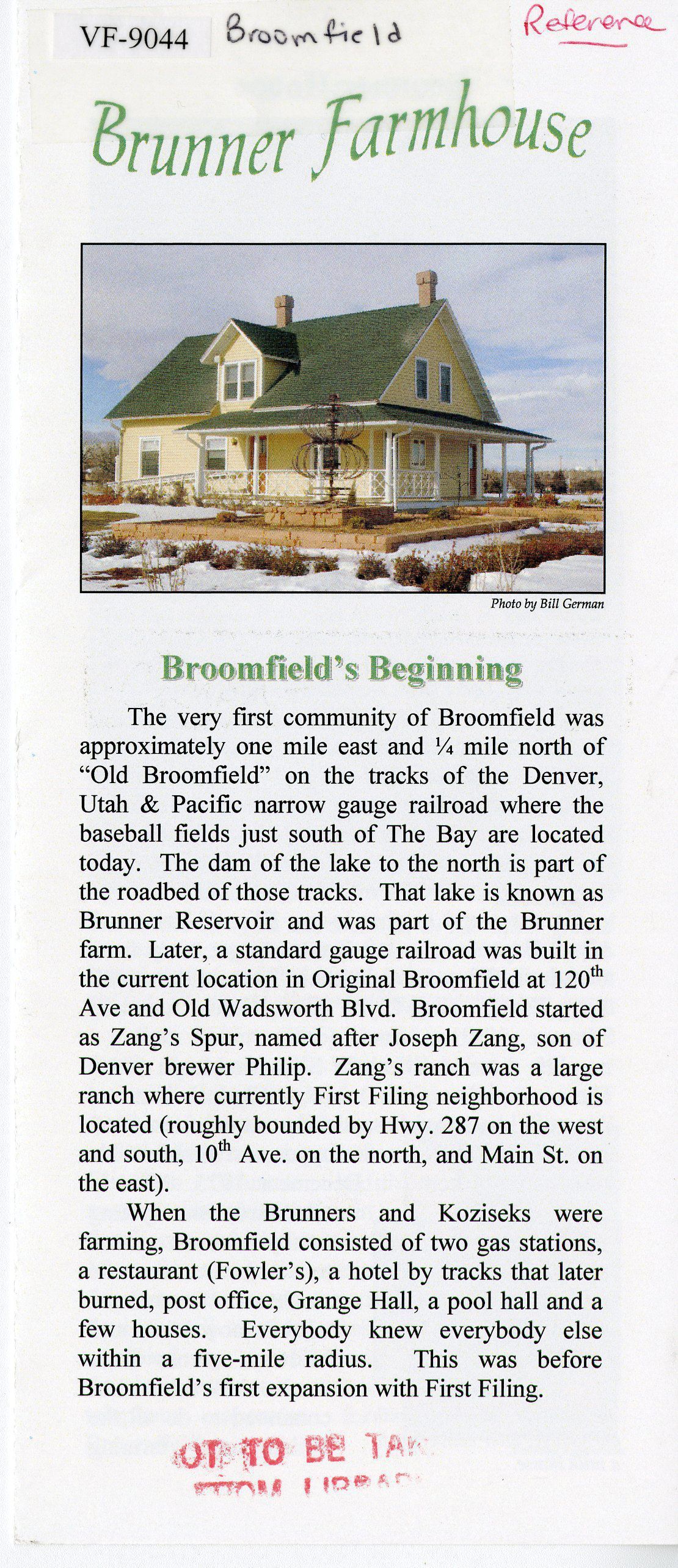 Brochure about the Brunner Farmhouse. Covers the beginning of Broomfield, gives a detailed history of the Farmhouse, including its move from 120th and Ash St. It gives an overview of the Brunner family, the Kozisek Farm, and the restoration of the Brunner Farmhouse.Lexicon