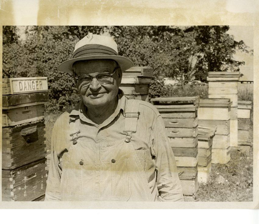 Postmaster and Bee Keeper Miles Crawford, wearing overalls and hat, posing in front of several kept hives, Broomfield Days