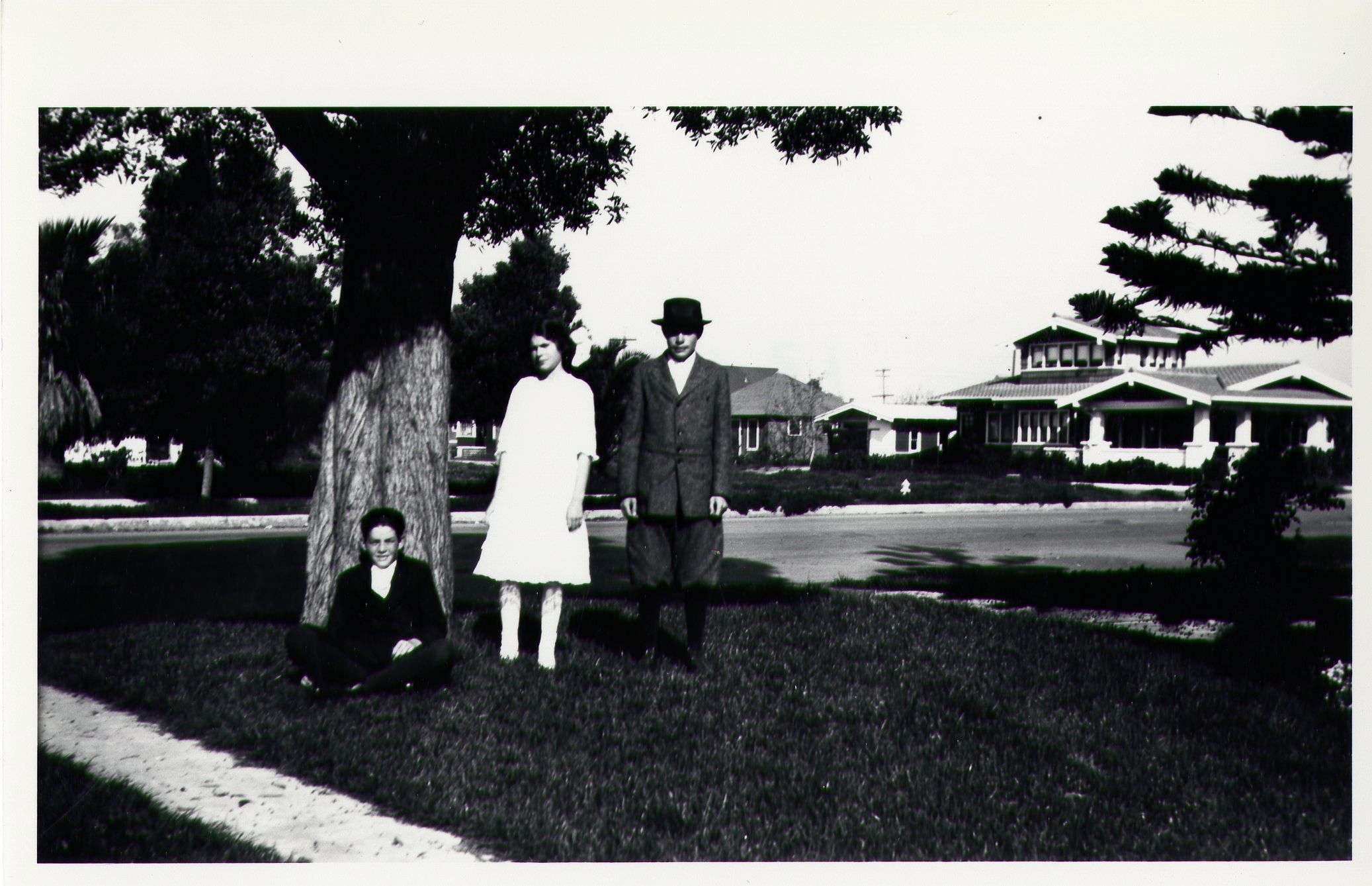 This is a black and white photo of the Crawford children in front of a row of houses and next to a tree. Based on the type of trees trees and the known family connection to California, likely this photo was taken in California when visiting relatives. From left to right you have Harry James Crawford (he is the one sitting), Dora Crawford, and Miles Crawford. Miles (born 1900) looks to be between the ages of 13 or 15 years old, likely dating this photo to about 1913 to 1915.