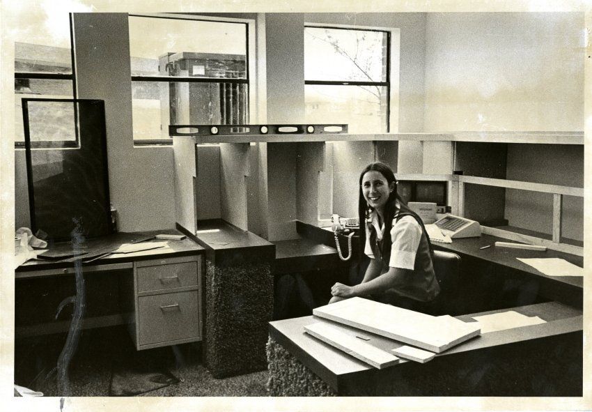 A young woman, identified as administrative assistant Linda Gill, sits in an empty office with windows behind her.Collection