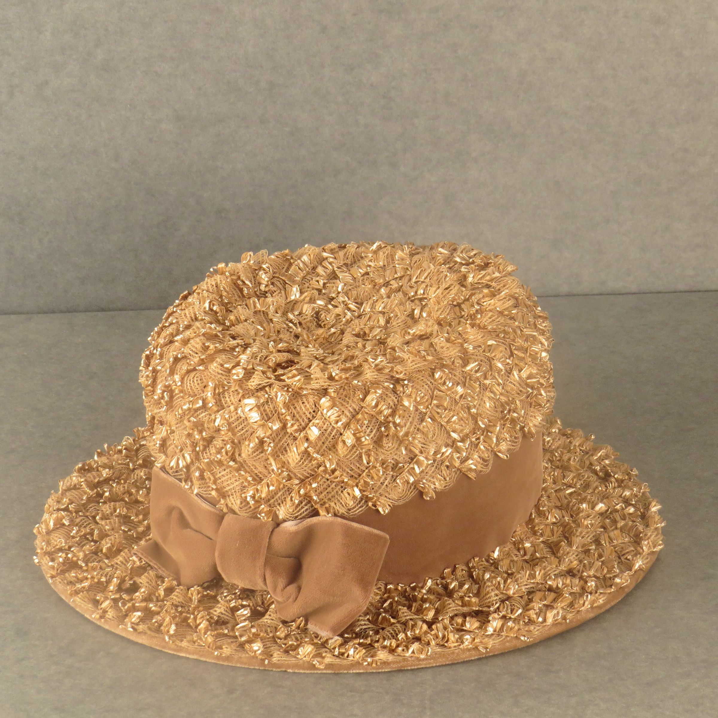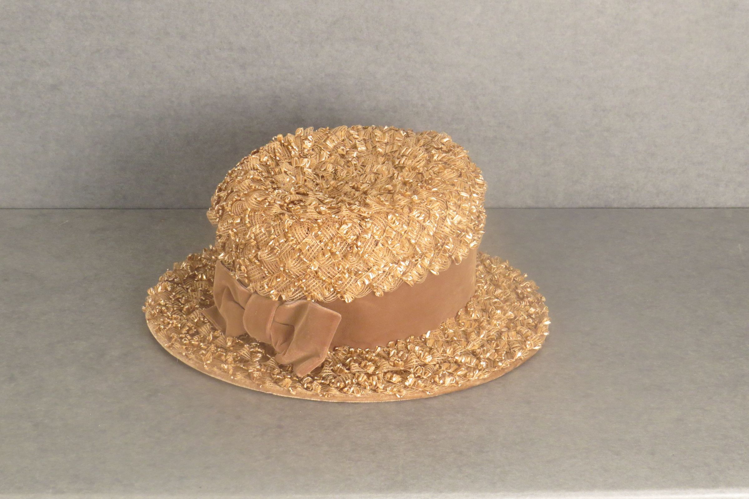 Dark tan hat with a tall crown attached to a 2.5" brim. The hat is made of a 3-D textile in grid pattern with loops and has a wide velvet ribbon around the base. A bow of the velvet ribbon is in back. The hat measures 4.5" (h) x 11" (diam).