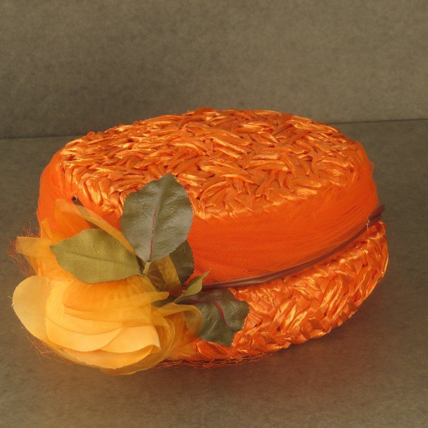 This orange straw high hat has a pillbox shape and matching orange tulle around the top of the crown. An orange flower with green leaves, both made of plastic and fabric, adorns the front. The hat measures 4" (h) x 7" (w) x 10" (l).Collection