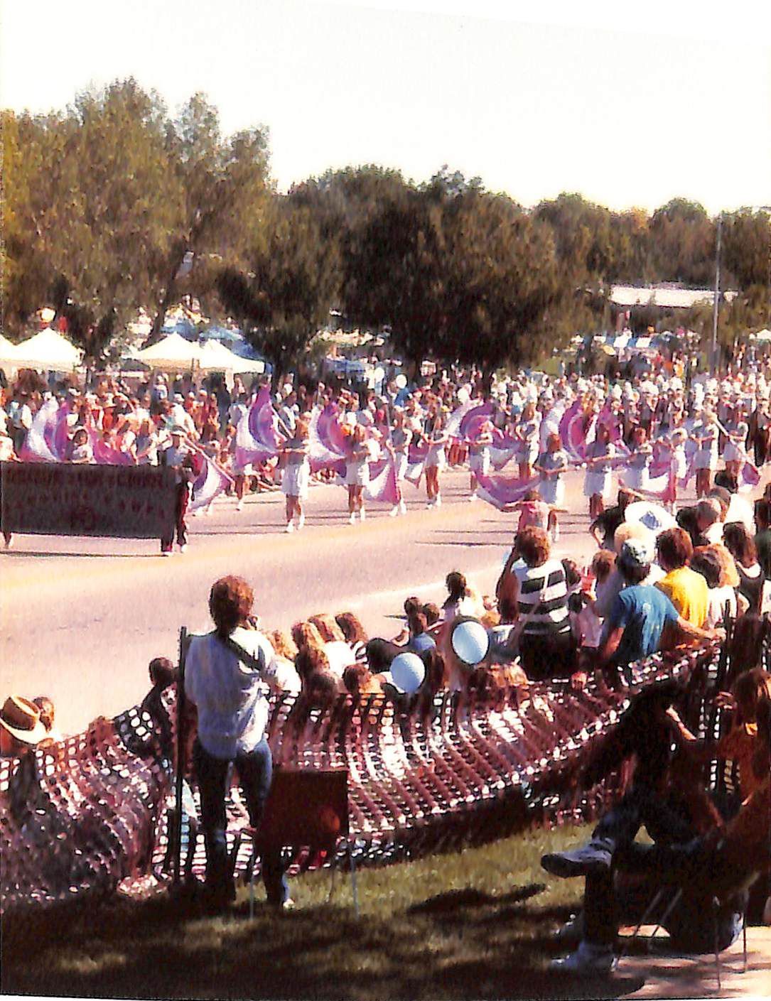 Item is a photograph printed on Kodak paper taken during the 1989 Broomfield Days event. The photo centers around a parade, with crowds gathered within a netted off area on both sides of the street. In the road, two students hold a banner between them that reads "Horizon High School Marching Hawks." Behind the banner are flag twirlers, which are followed by a uniformed marching band. White booths hosting other festivities are present in the background beneath some large trees. Weather is sunny and cloudless.Photograph Details