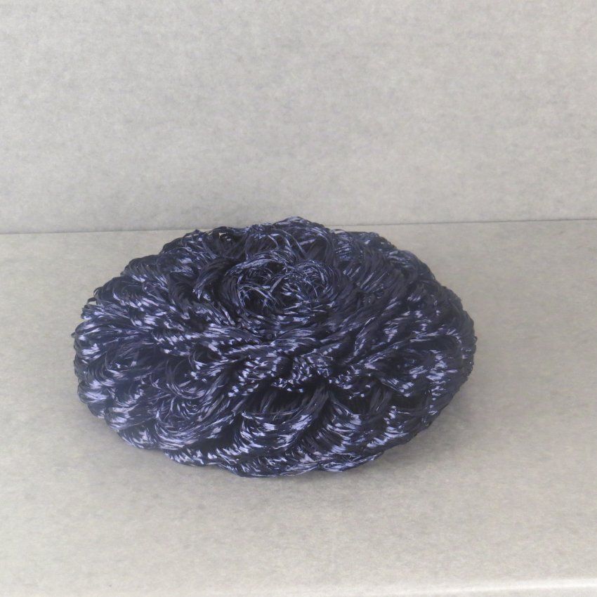Navy staw material in circular loops all over hat. The straw material has a sheen to it. Flattens when not in use, the head would give it shape when worn. Midnight blue curls. 1950-60 hats (Eng. & Am.) The hat measures 4" (h) x 9" (w) x 10" (l).