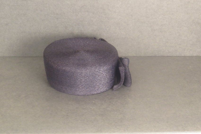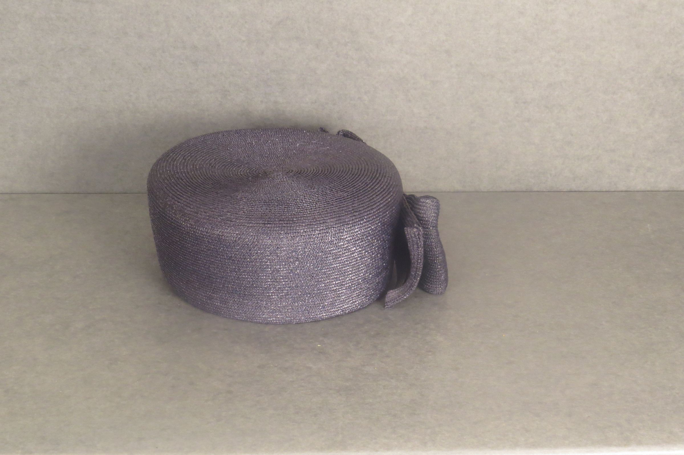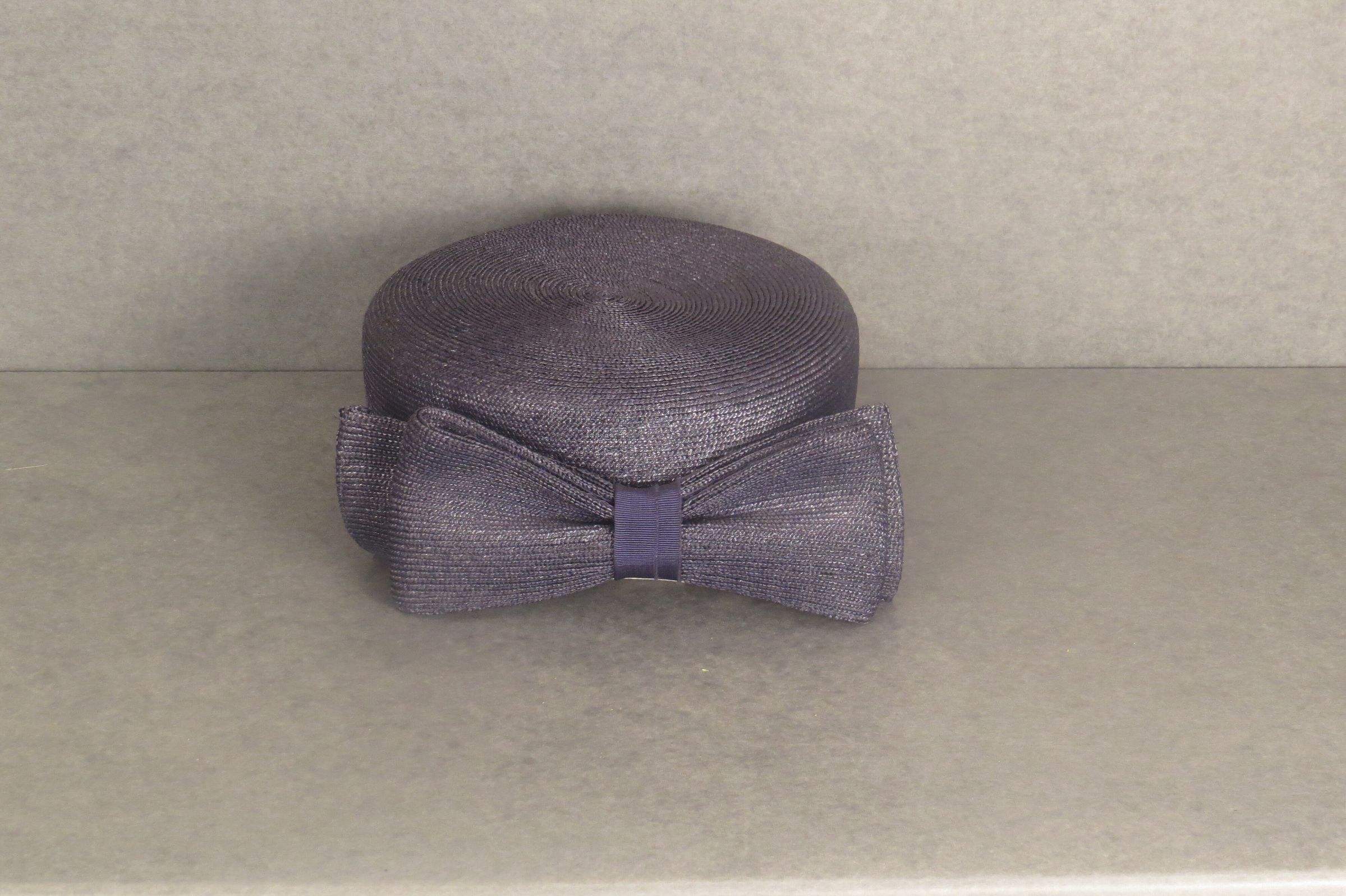 Navy straw pillbox-style hat---no brim, tall straight crown, and circular top. The hat, made by milliner Otto Lucas, has a large bow of the same material on one side. The hat measures 4" (h) x 7" (w) x 8" (l).
