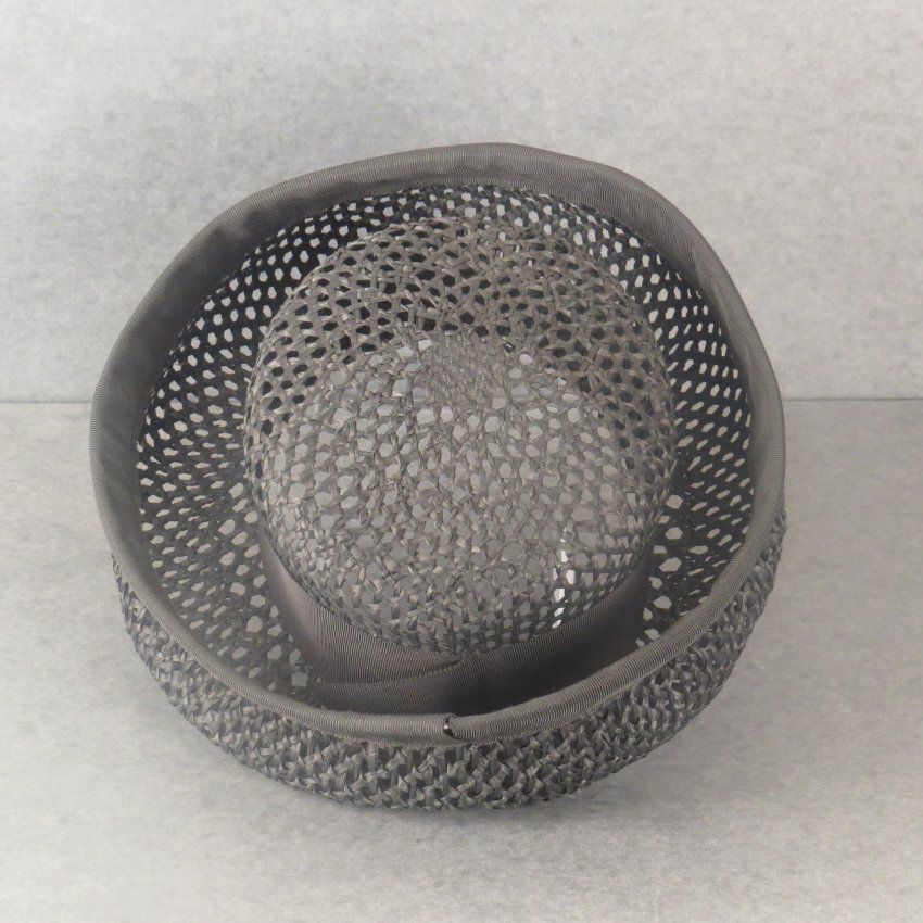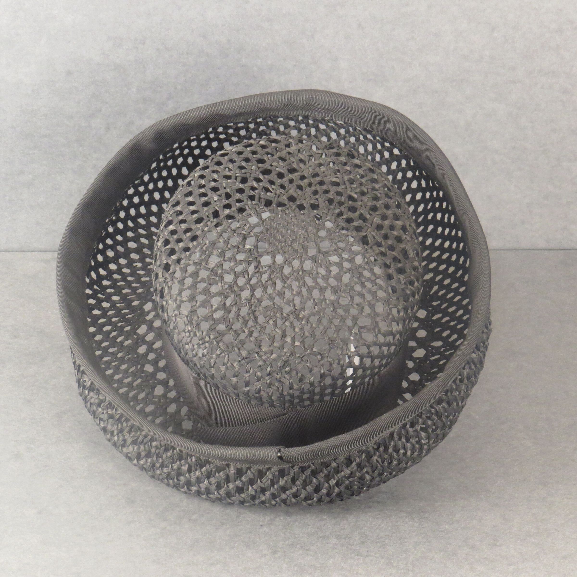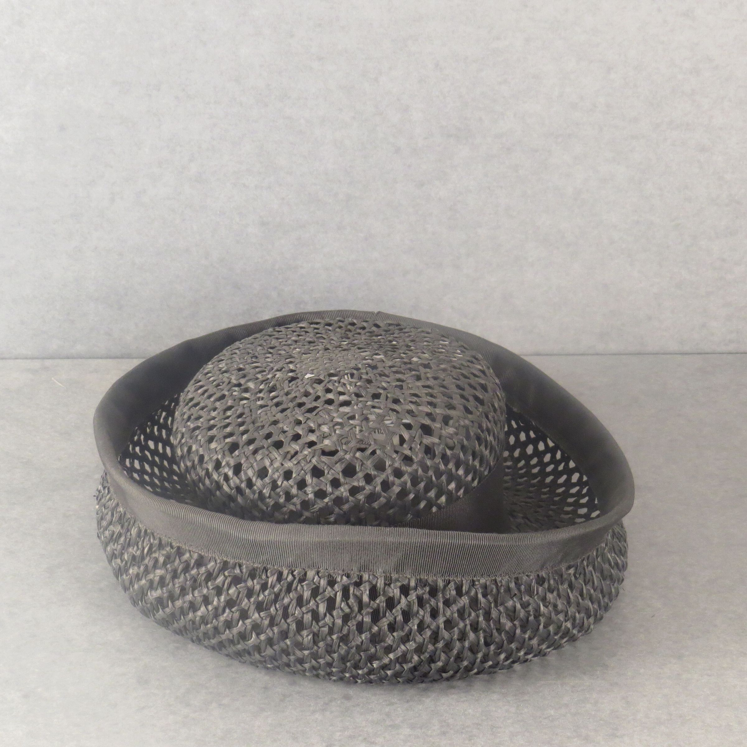 Loosely woven black straw hat with wide ribbon around base and around the edge of the brim. The brim has been turned up to almost cover the fairly tall crown. Made by London-based millinery brand Edward Mann for Selfridge's Department Store in London. The hat measures 4" (h) x 11" (diam).