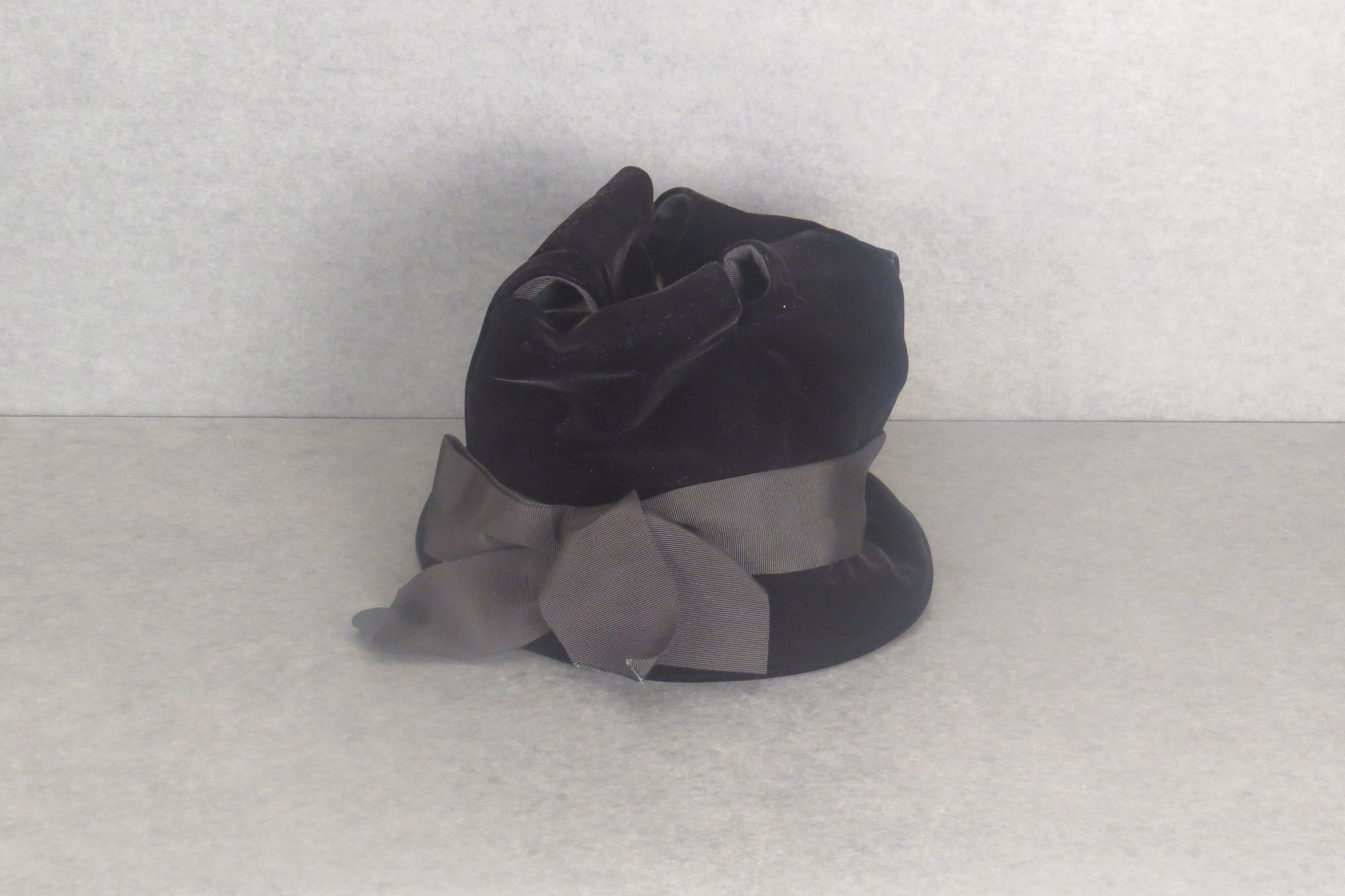 Black velvet hat small short brim and tall crown. There is a large grosgrain ribbon around base that ties in a large bow in back. The crown of the hat is unusual as its four pieces that meat in the middle and create a vented crown. The hat measures 7" (h) x 8.5" (w) x 10" (l).