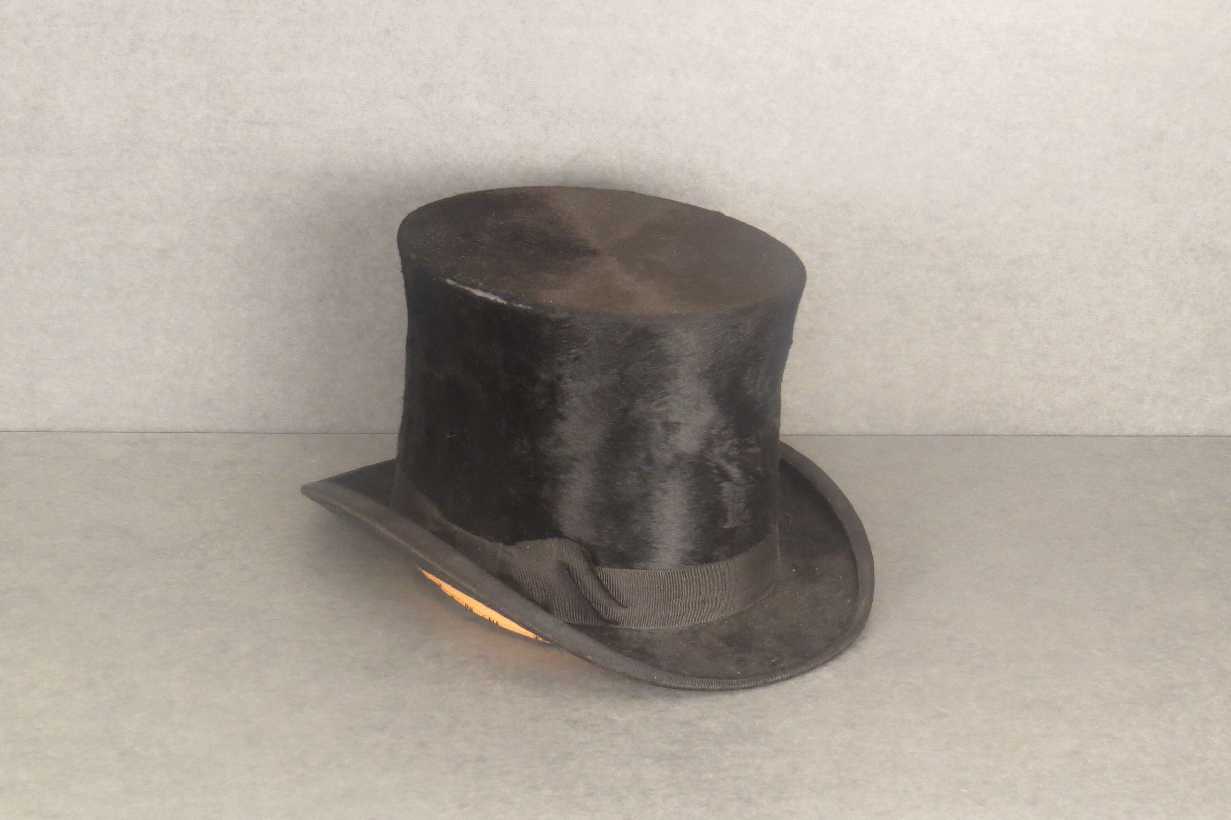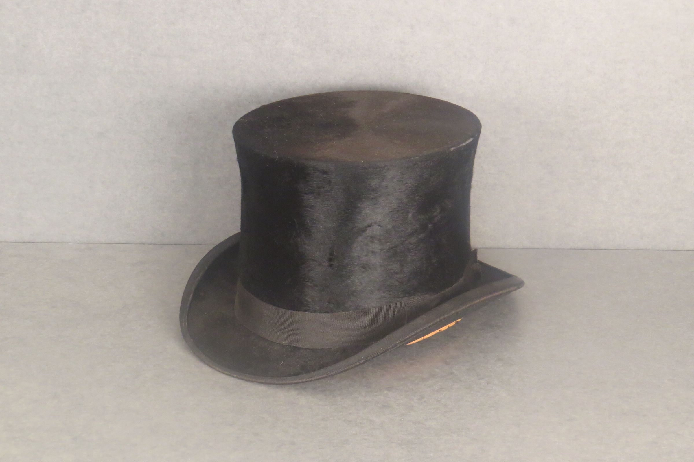 Black top hat covered in beaver felt. Tall stovepipe crown with slightly larger top than base. Black grosgrain ribbon around base with bow at side. The ribbon is also covering the edge of the brim that turns up away from the wearer on either side. On the inside, there is a leather band around base and on the inside of the silk lined crown is the company name, "The Goodman & Neill Clothing Company / Greeley, Colo." The hat measures 6" (h) x 12" (w) x 12" (l).