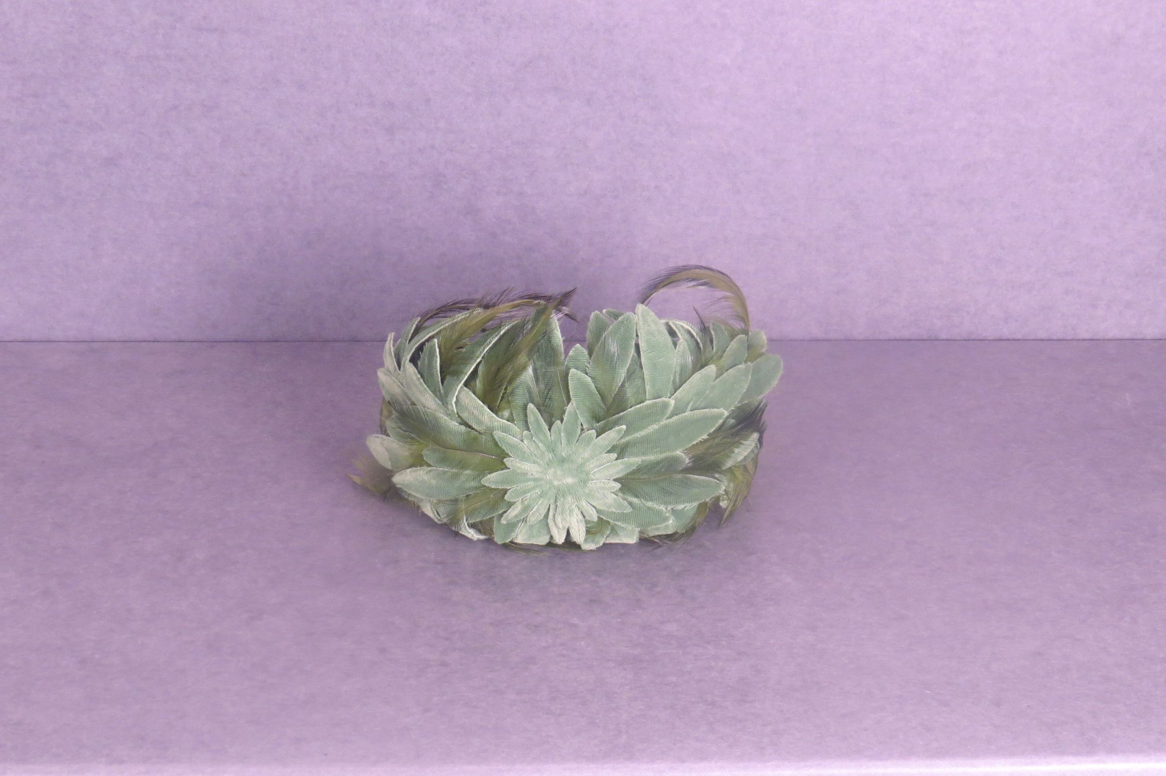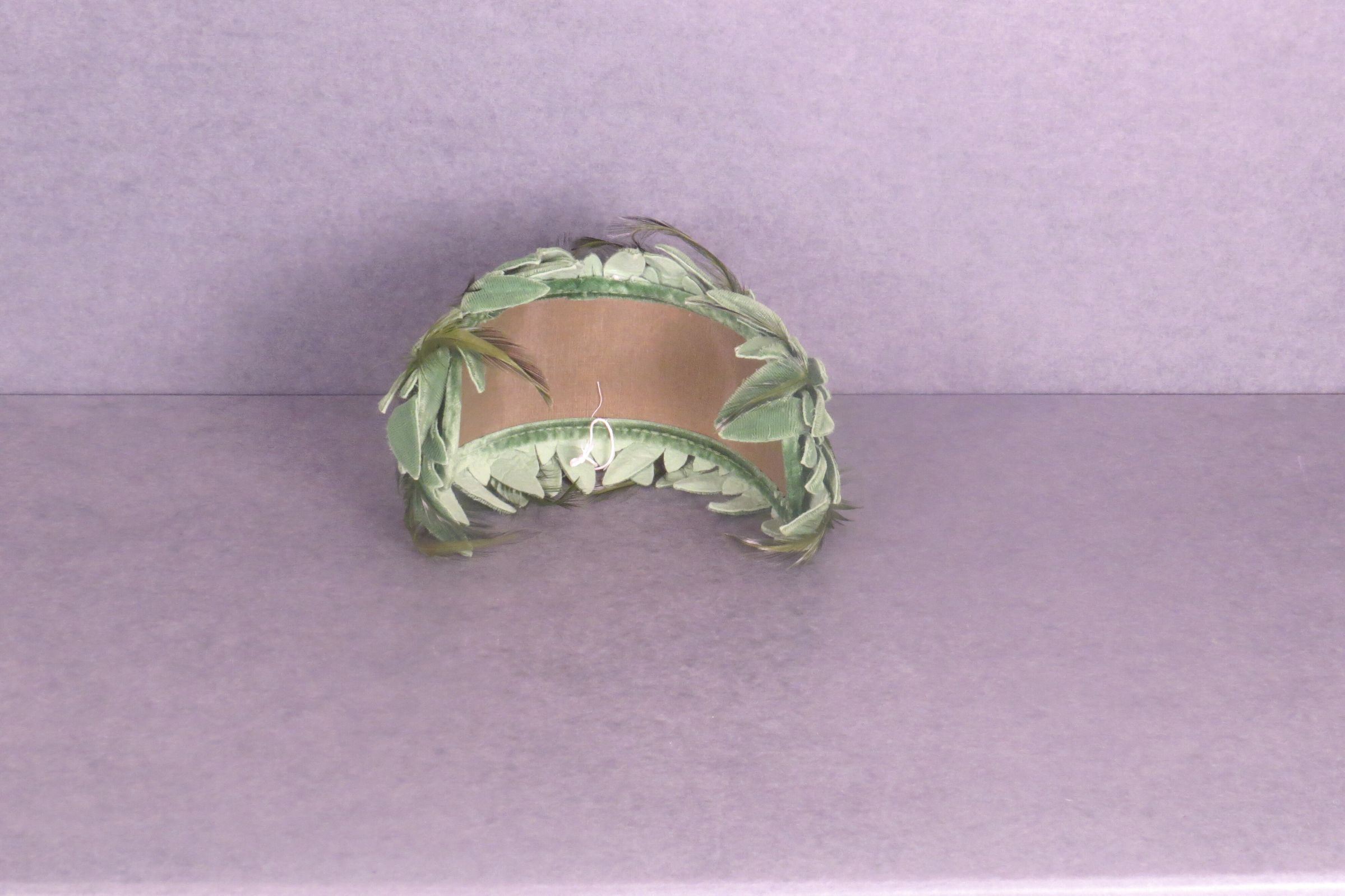 Wide headband style bandeau covered with green feathers and green velvet cut into the shape of leaves. A stiff horsehair or starched material was used to create shape. Green feather and velvet headband with velvet cut into leaves. The bandeau measures 4.5" (h) x 3.5" (w) x 7" (l).