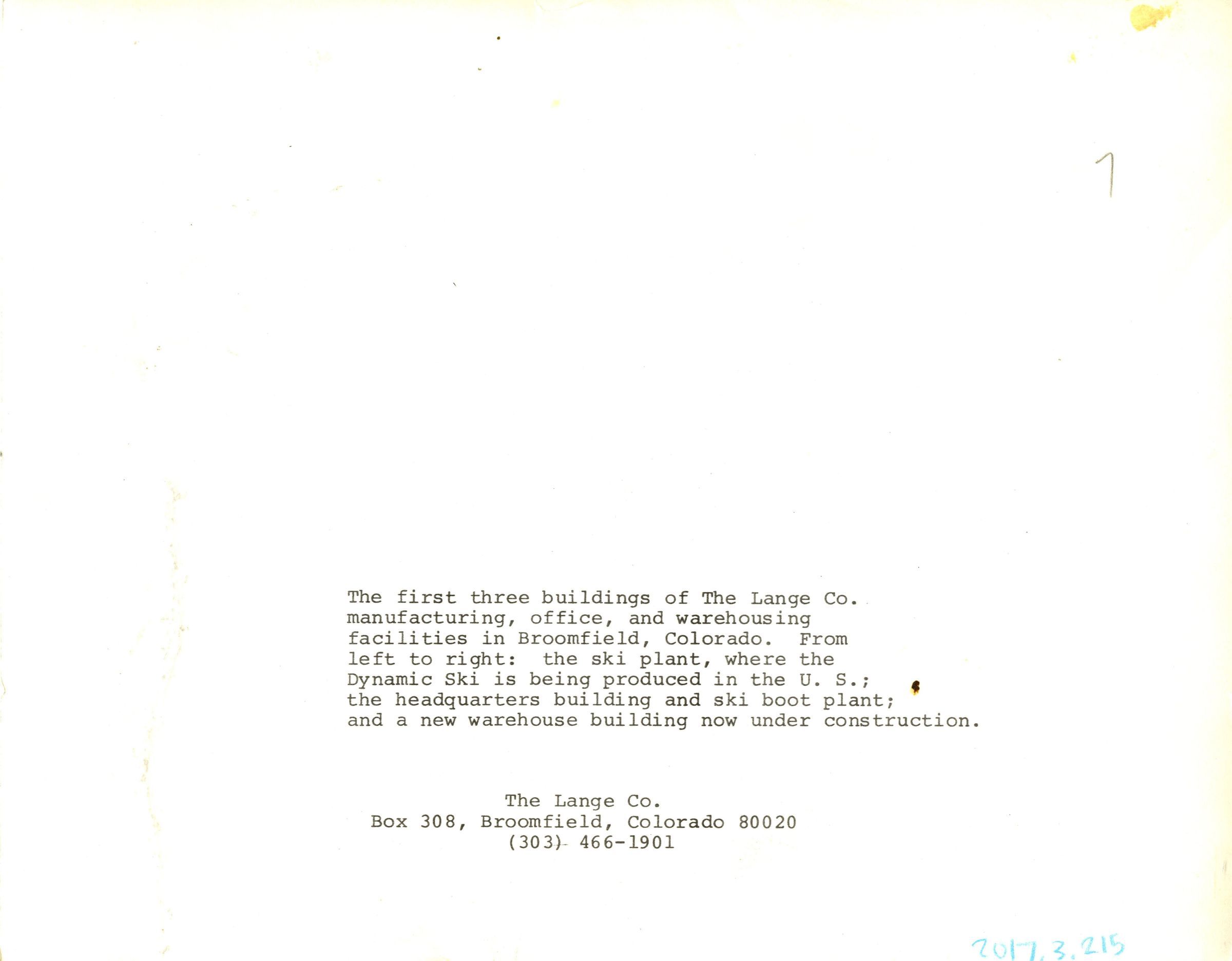 The first three buildings of The Lange Co. manufacturing, office, and warehousing facilities in Broomfield, Colorado. From left to right: the ski plant, where the Dynamic Ski is being produced in the U.S.; the headquarters building and ski boot plant; and a new warehouse building now under construction.