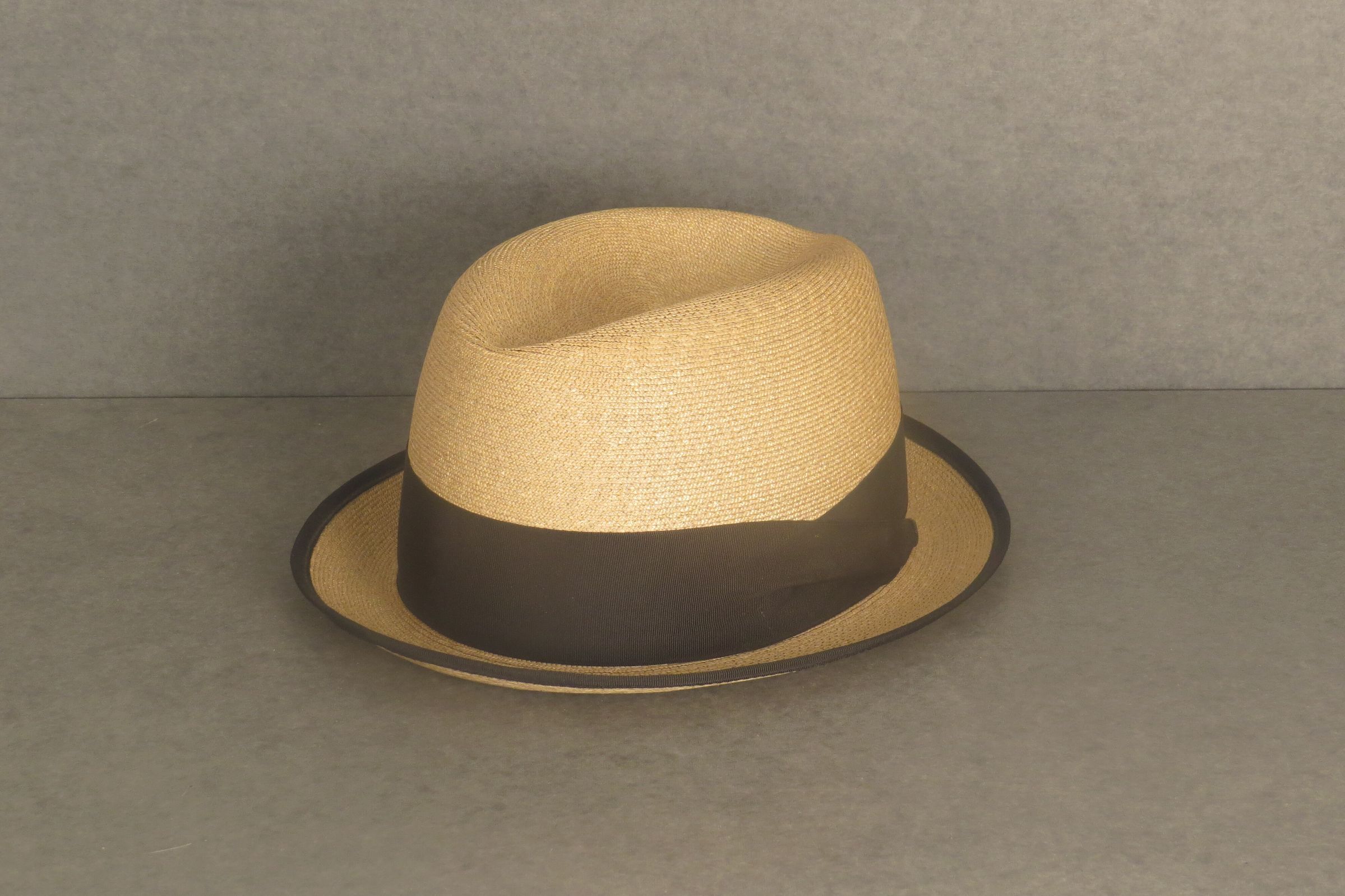 Tan straw Stetson with black ribbon around edge of brim and thick ribbon around band. On the inside the band reads "Stetson" and "WAR" which are the donor's (William A. Reynolds) initials. The hat measures 4.5" (h) x 9.5" (w) x 11" (l).
