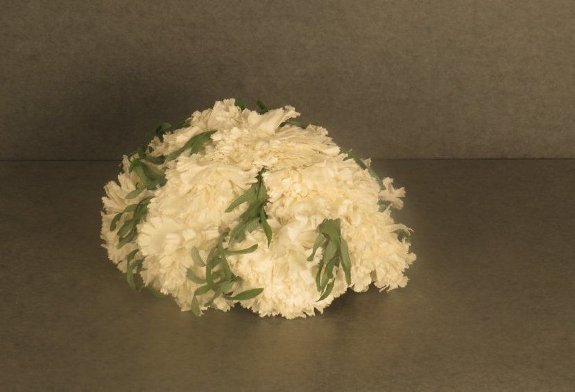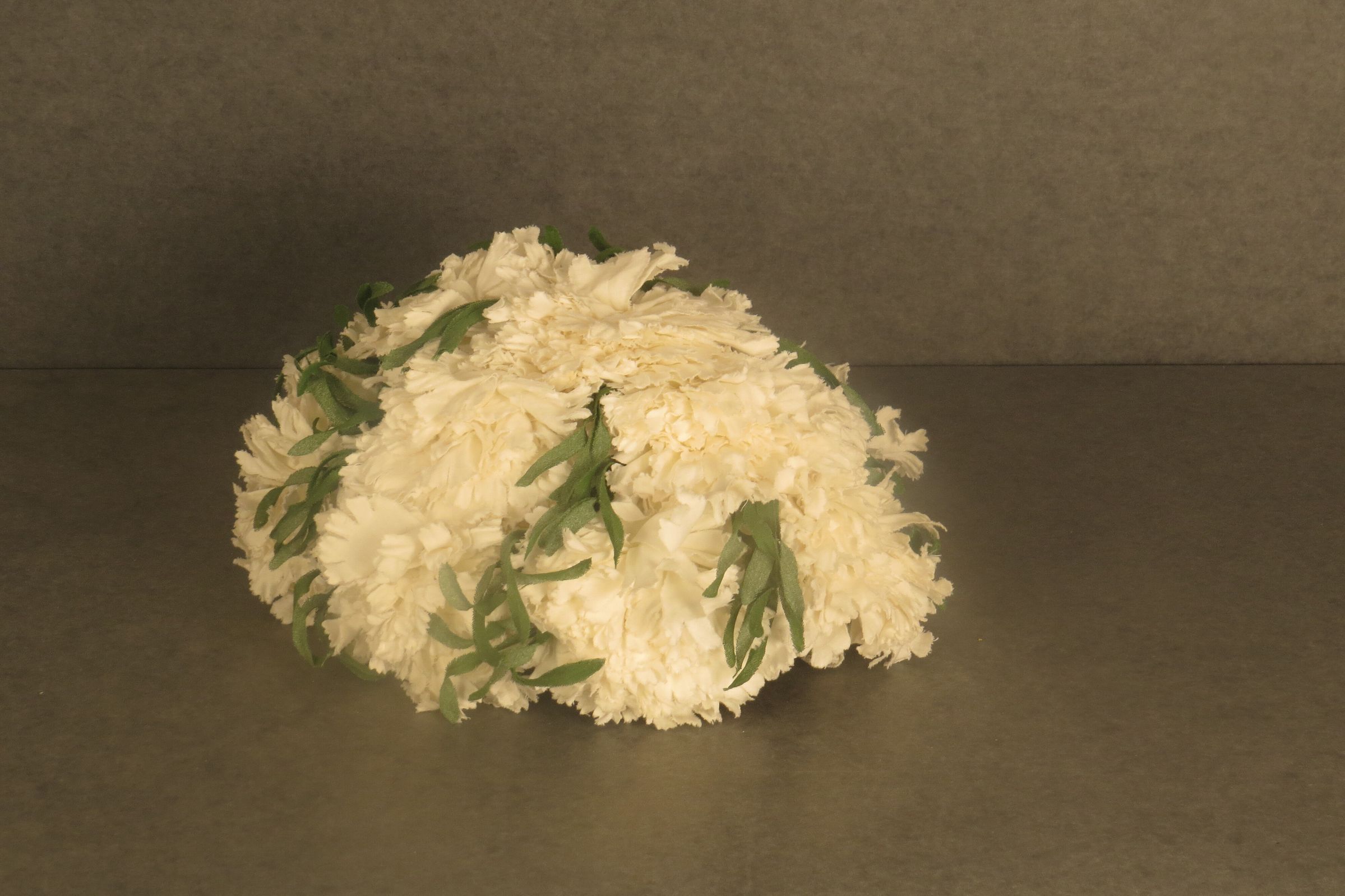 White fabric flowers cover entire dome shaped hat. No brim. Green fabric leaves are interspersed throughout. The inside is a stiff material that supports the shape. Tag reads "Neusteters / Denver." The hat measures 4.5" (h) x 9" (diam).