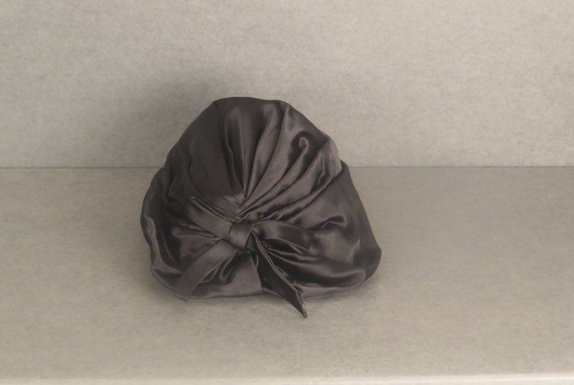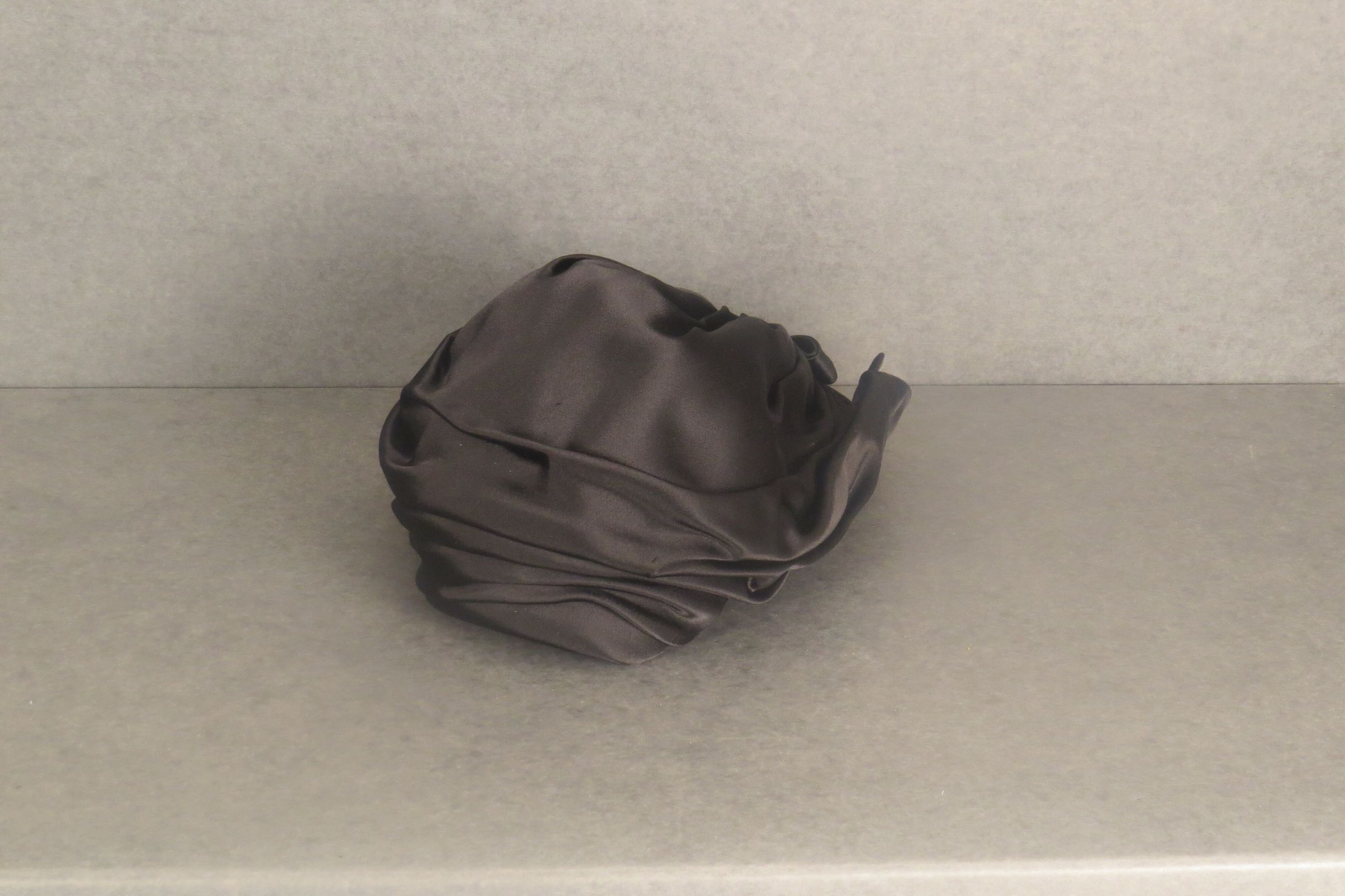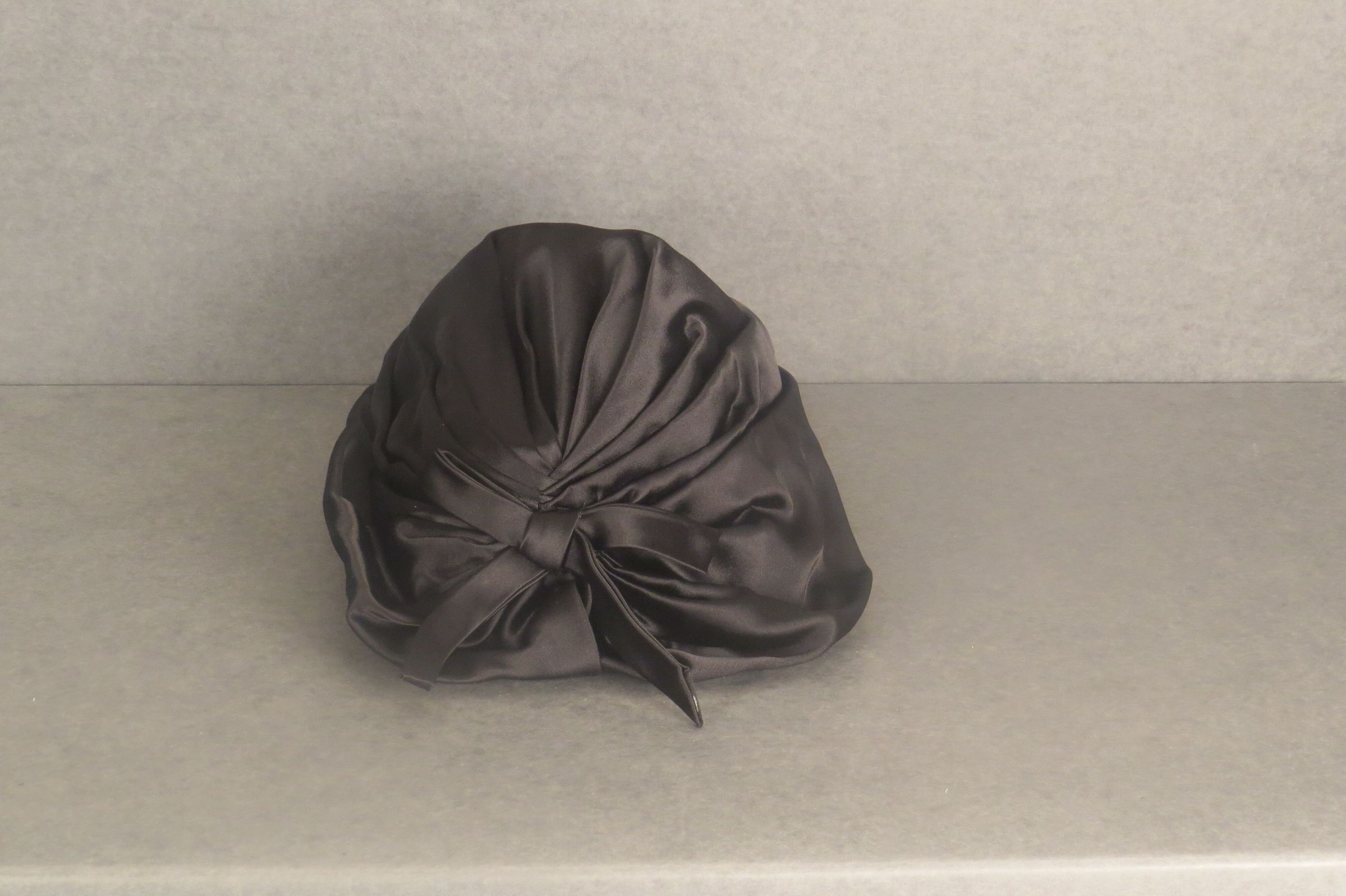 Black satin hat with turban-like aesthetic. It has been gathered around the base (no brim) and then gathered even more inback. Also a self-fabric bow at back. Tag reads "Emme Boutique." The hat measures 4" (h) x 7" (w) x 10" (l).