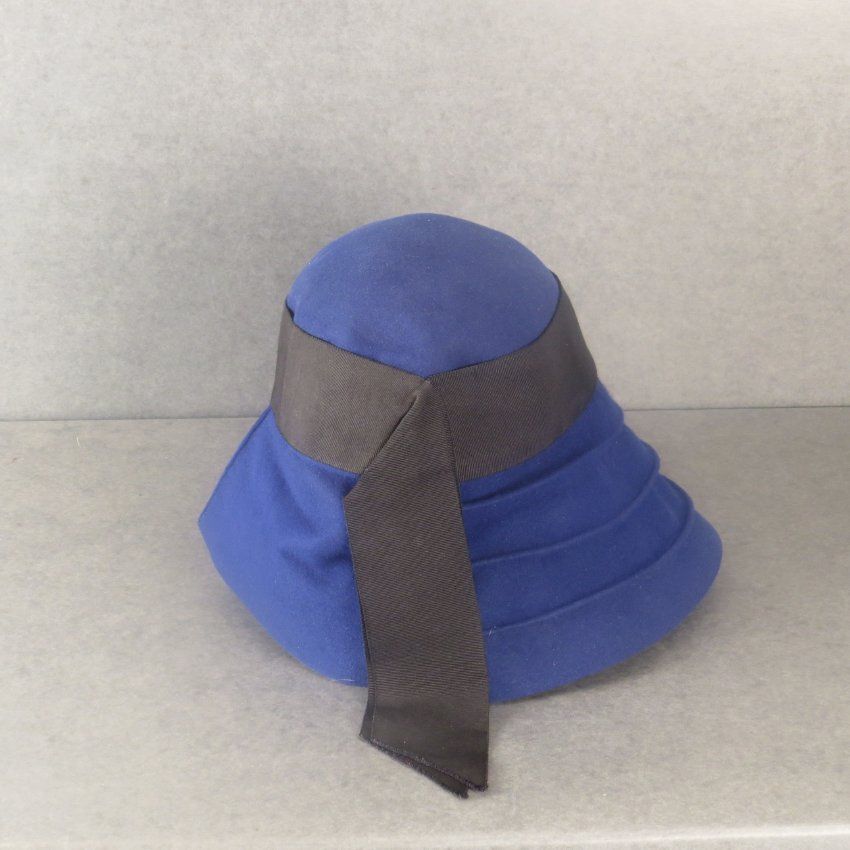 Blue felt hat with large droopey brrim that is wider in front and also has tiny pintucks at 1.5 inch intervals. There is a wide black ribbon around the base of the rather small crown. The hat measures 5" (h) x 9" (w) x 11.5" (l).