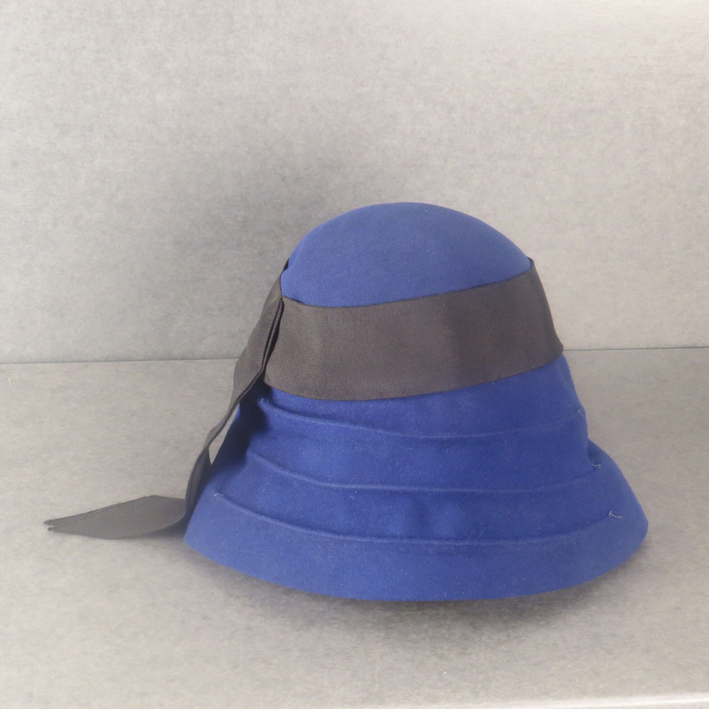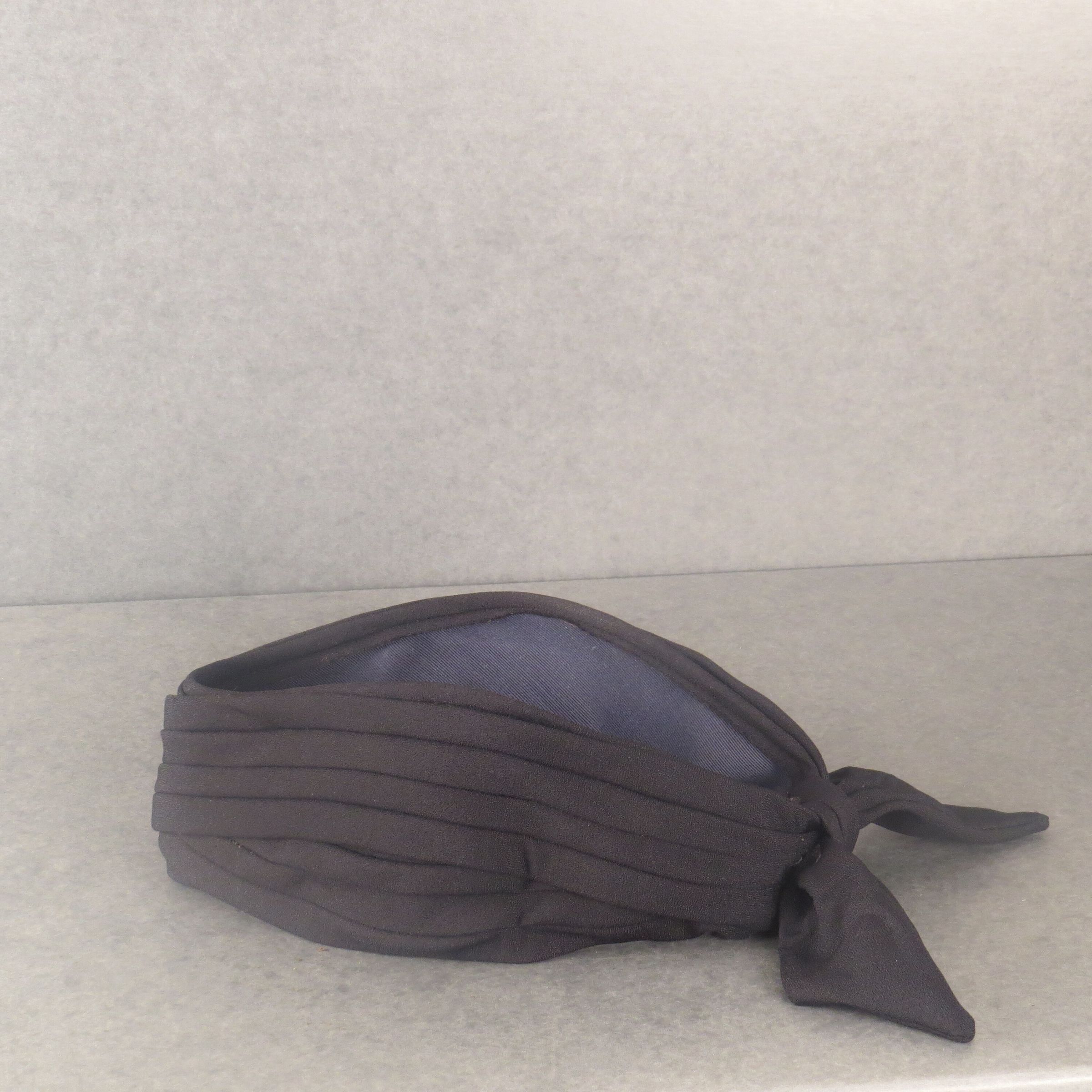 Black crepe turban-like headband with bow at back. The material around the front and sides has been gathered/pleated to create shape. And at back there is a small knot with 3 inch ties. The hat measures 4" (h) x 11.5" (l).