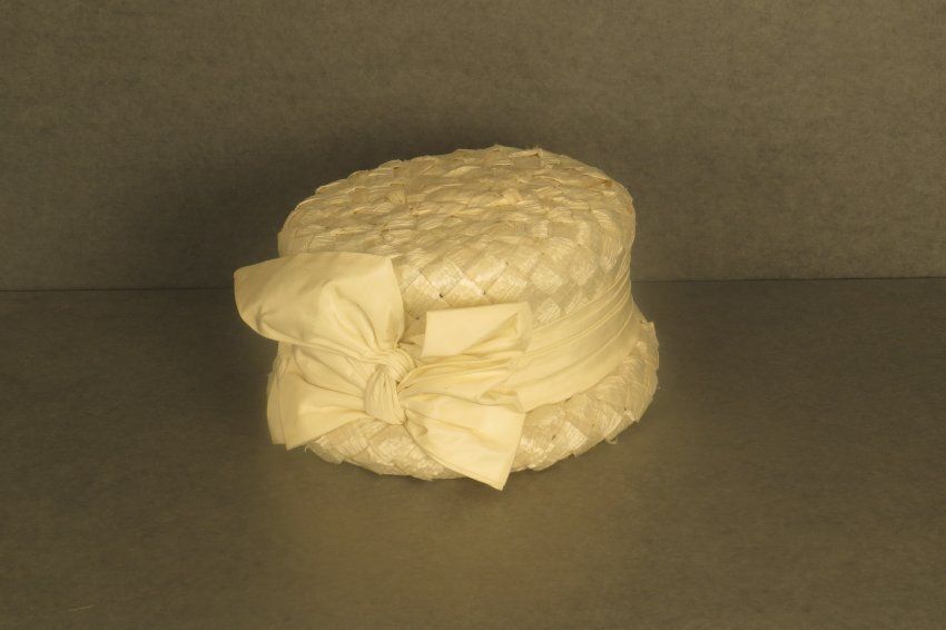 Ivory staw/plastic tall crown hat with ivory material around sides. The straw material is in a thick plain weave that adds texture. At back is an extremely large bow. This would be considered a high hat. The tag says "Neusteters / Denver." The hat measures 4.25" (h) x 7.5" (w) x 9" (l).