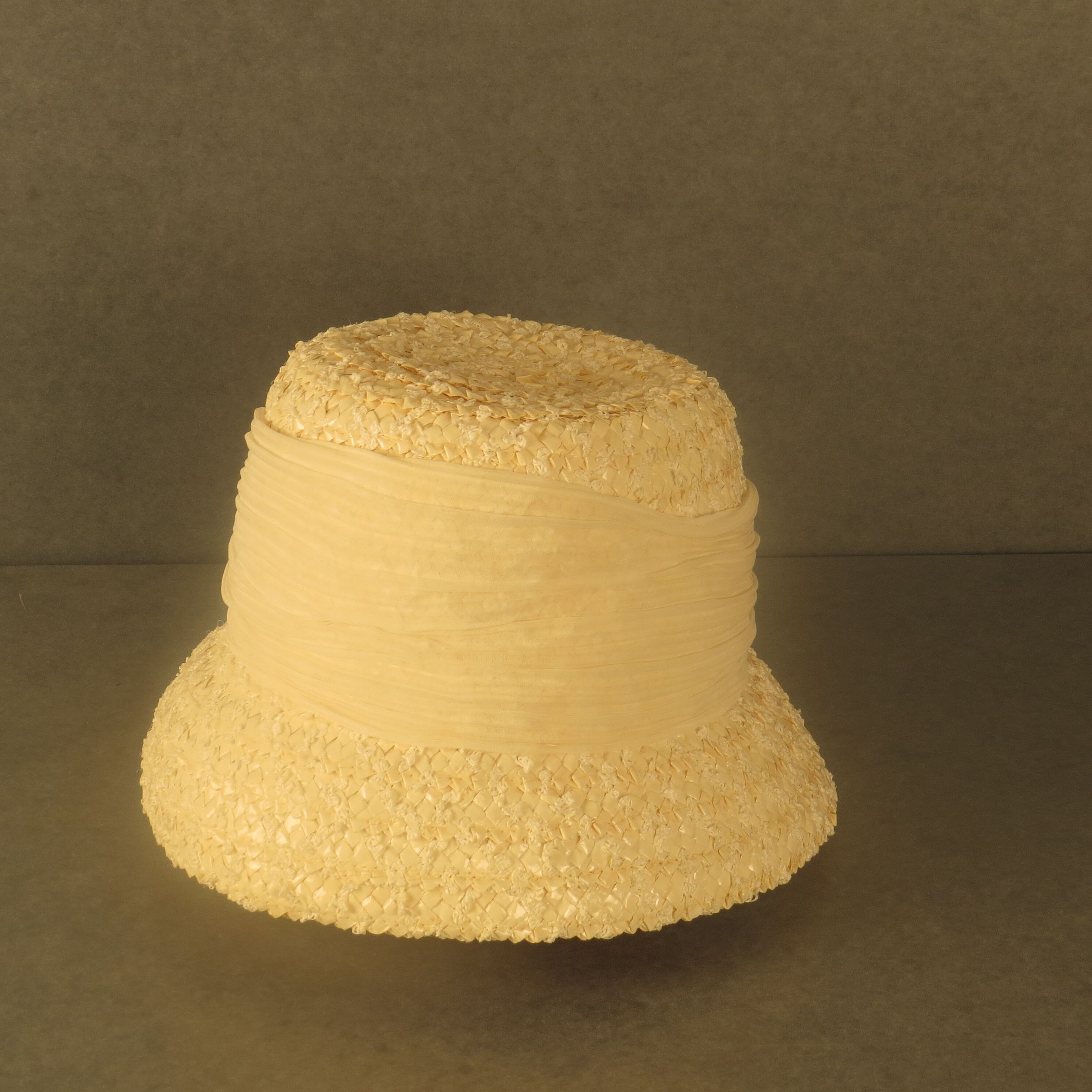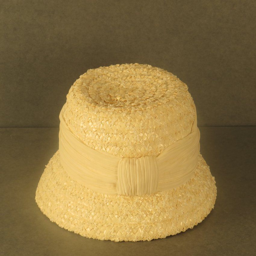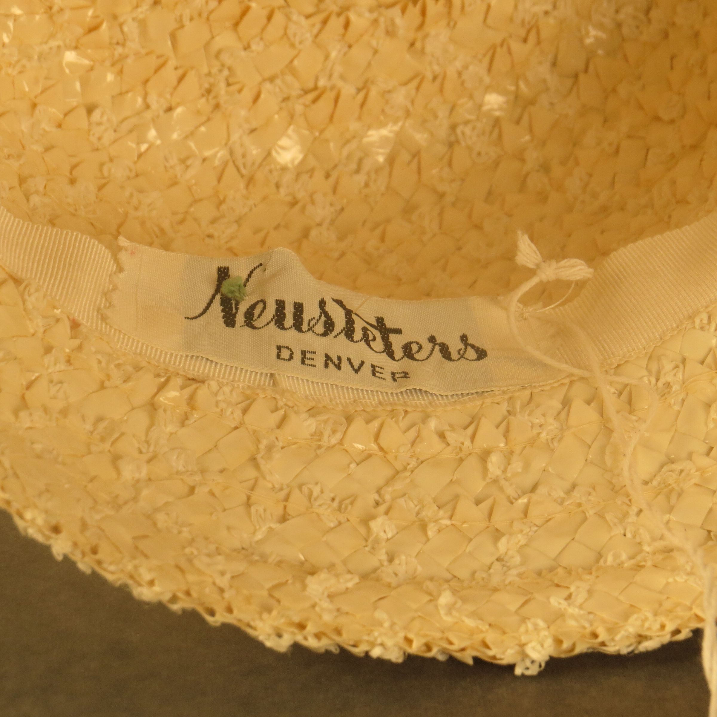 Ivory straw and plastic material that is a small weave but has a lot of three-dimensionality to it. It has a downturned brim with a tall crown that has gathered ivory material around most of the length of the crown. Tag reads " Neusteters / Denver." The hat measures 6" (h) x 10" (diam).