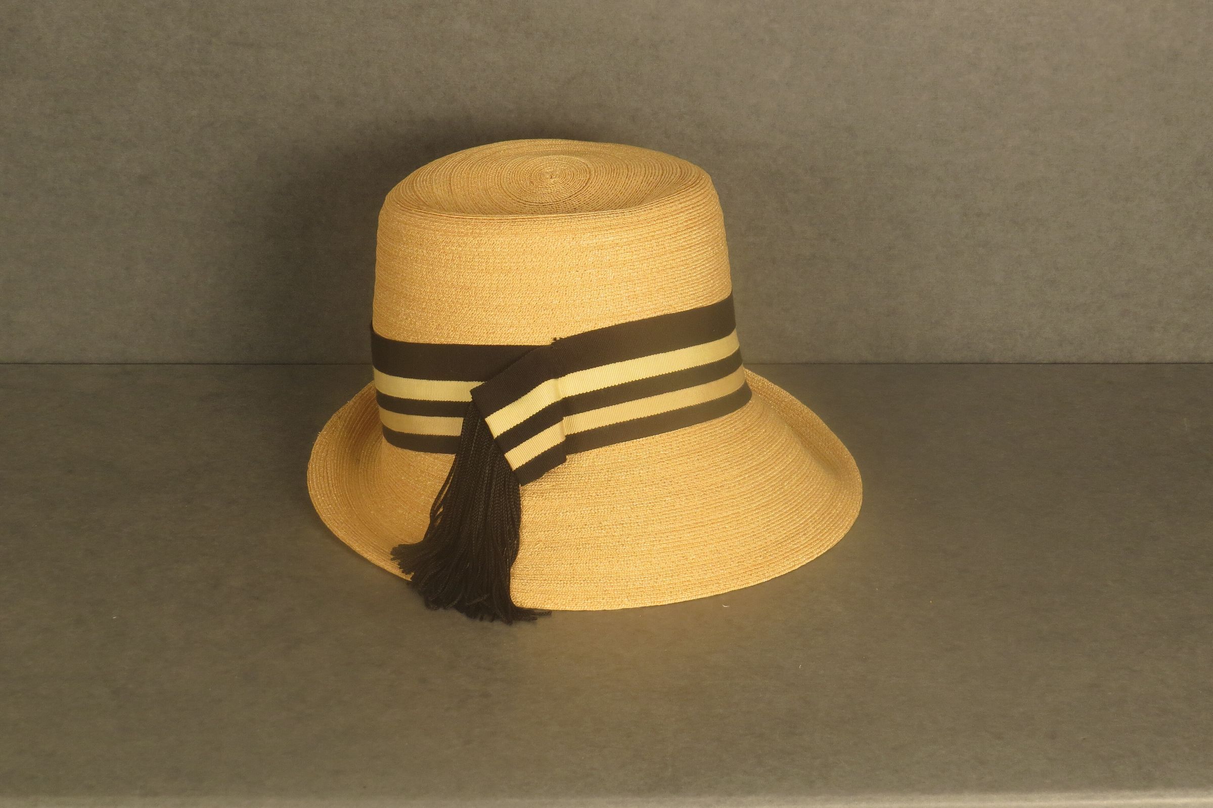 Tan straw hat with tall crown and brim that points down in front and is rolled up around back. There is a wide black and tan ribbon around the base of the crown that ends on wearer's right side with a black tassel. Tag reads "Schiaparelli". The hat measures 7.5" (h) x 10.5" (diam).