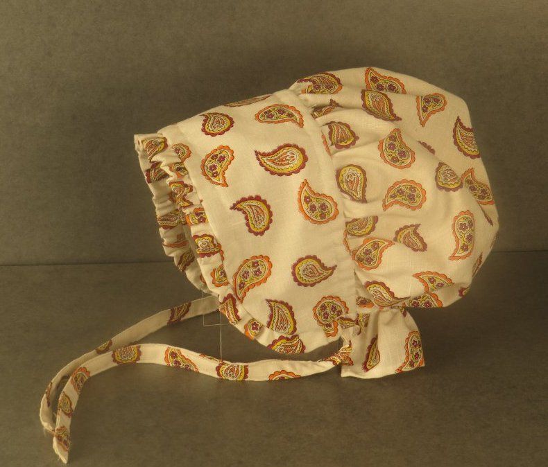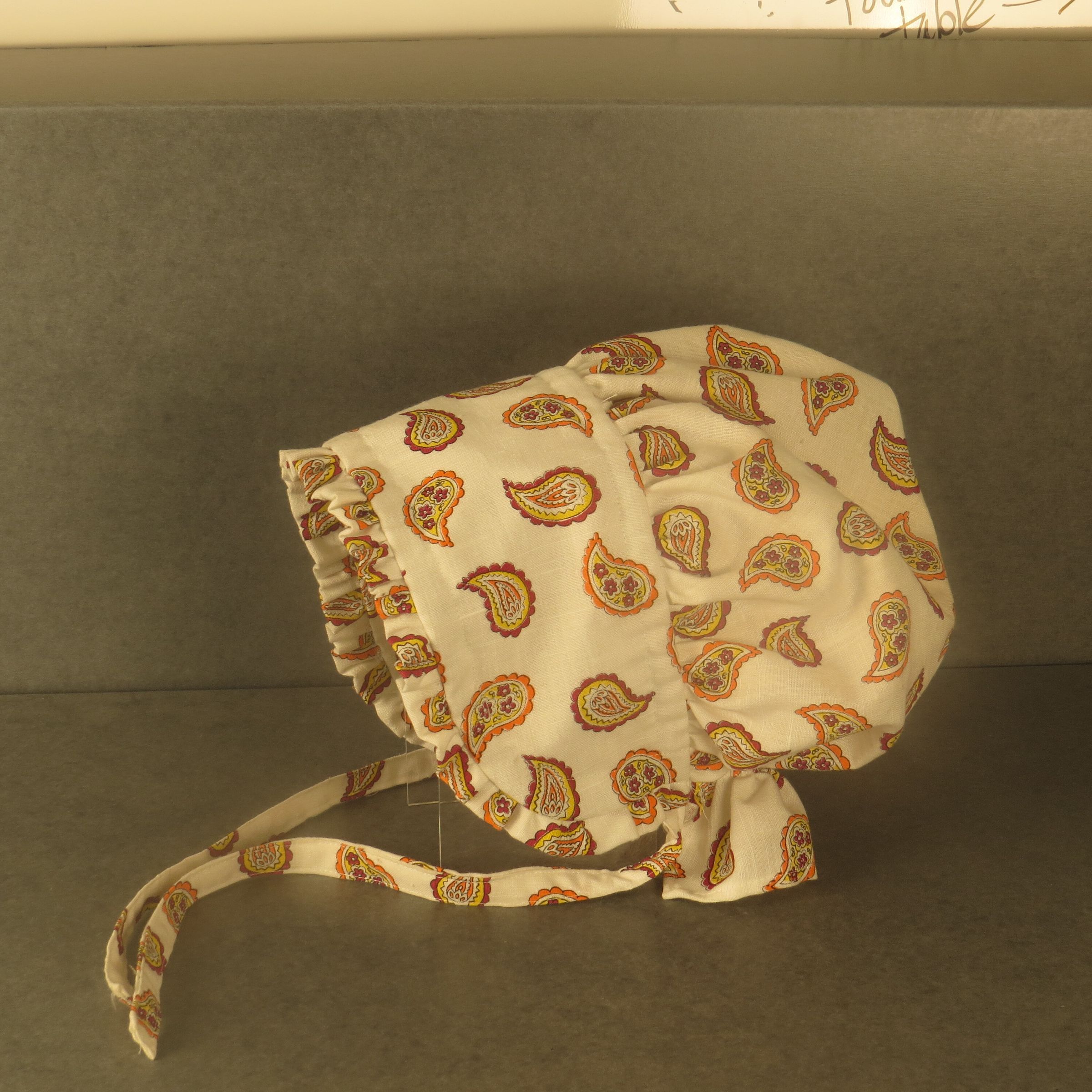 This reproduction sunbonnet has a gathered crown on the back of the head. There is a large top and side brim that is attached vertically to the crown. At the end of the brim is a short ruffled trim. The crown is gathered at the base of the wearer's neck into what is called a beaux, this is fairly short. There are two self-fabric ties attached to the gathering around the back of the neck. The sunbonnet measures 12" (h) x 12" (w).
