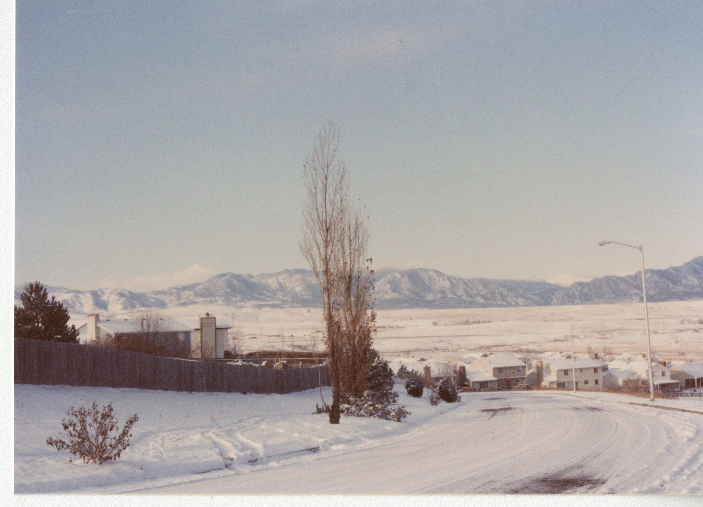 Color photograph showing houses in the Lac Amora neighborhood of Broomfield, CO. Photograph shows the foothills in the background.