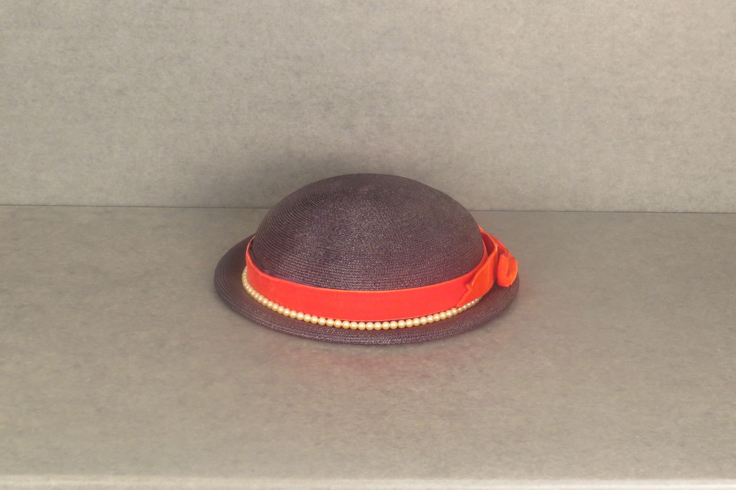 Navy straw hat with dome crown. Red ribbon and string of pearls are positioned at the base of the crown. Red ribbon ties in bow in back. Small narrow brim. The hat measures 2.5" (h) x 9" (diam).