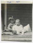 Photograph of a boy and a toddler sitting outside on a porch. They are sitting on a blanket and have a pillow between them and the house. The children are identified as Clyde and Gib.