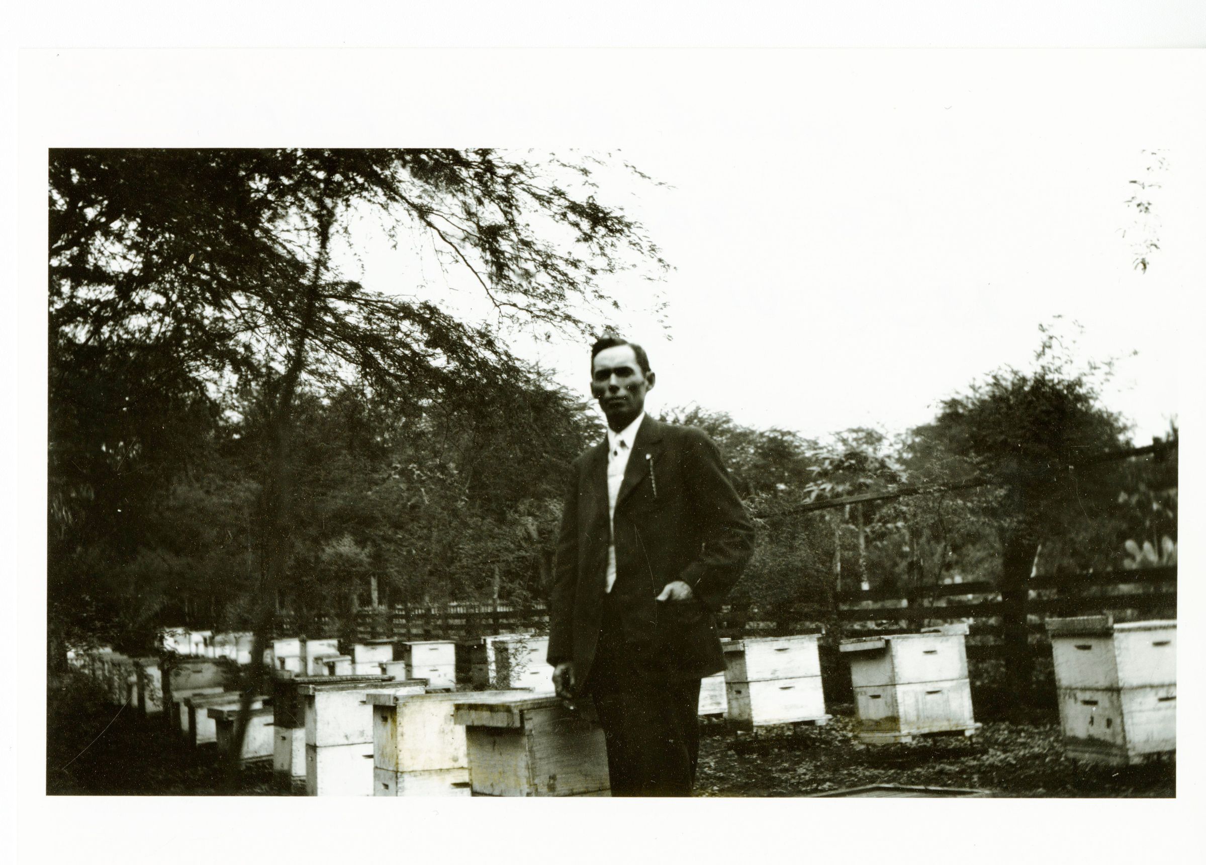 Black and white photograph that depicts a man in the Crawford Honey Farm. The man is probably Harry R. Crawford. In the background are several honey bee boxes.