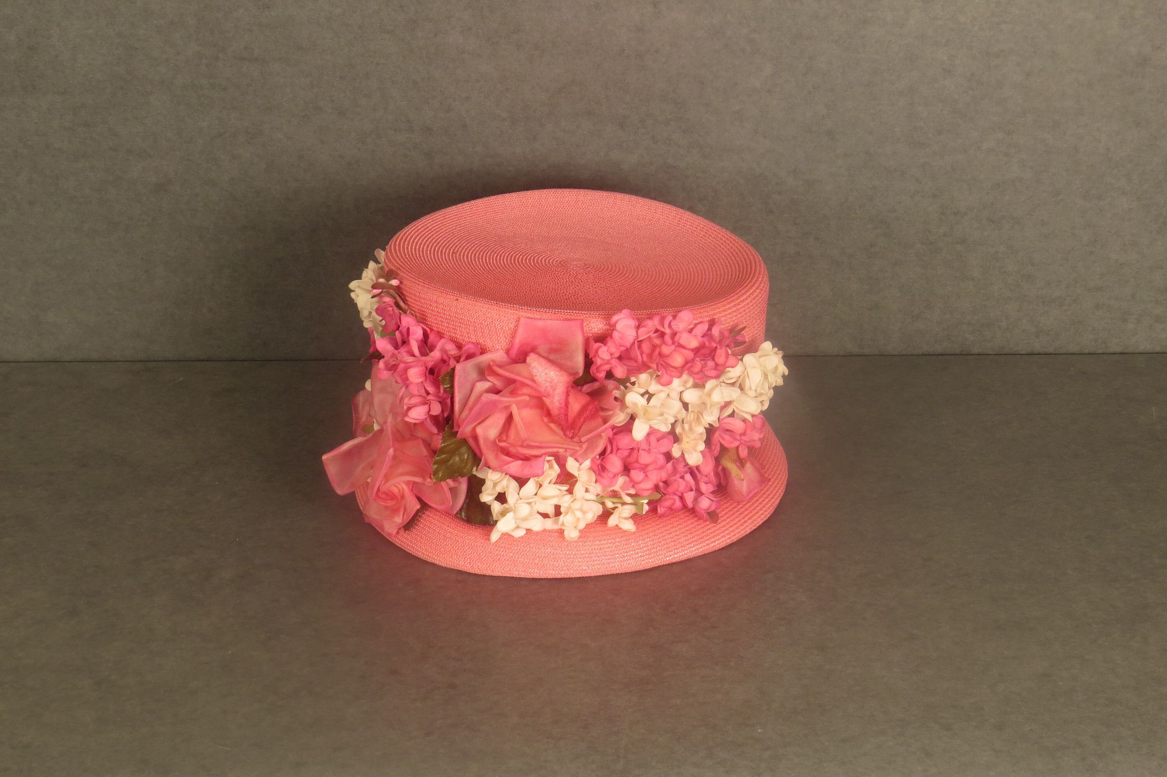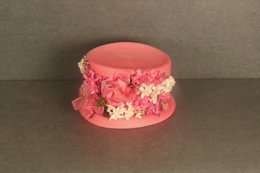 Pink straw hat with tall crown, short toque brim and pink velvet ribbon around base. The front of crown is covered in pink and white flowers. A tag on the inside says "Union Made". The hat measures 5.5" (h) x 8" (w) x 9" (l).