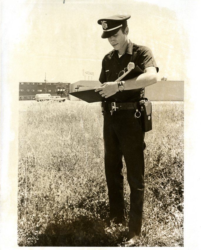 Policeman standing in field, writing in binder: "Another violation" Police officer has been identified as Rod Miller.