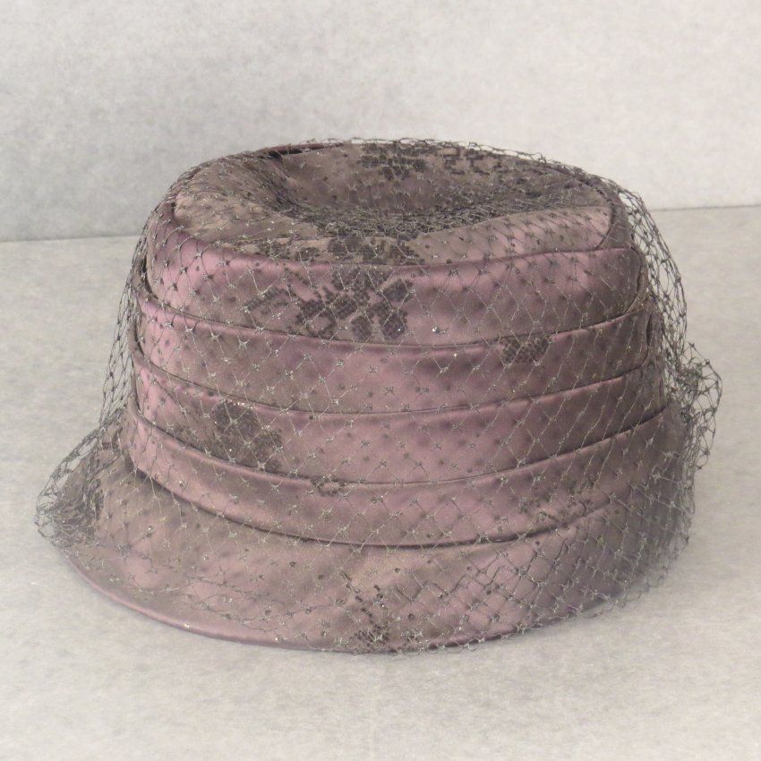 Black satin jacquard high hat with short downturned brim. The crown has been pleated throughout its height and there is black netting covering the entire hat. The hat measures 5" (h) x 8.5" (diam).